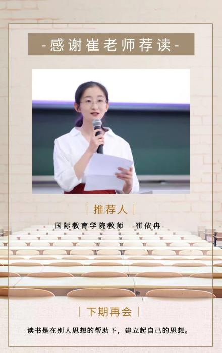31期“好书共读”的推荐者既有刚刚参加工作的新进教职工,也有教学能手与业务骨干,既有60多岁的退休教授,也有年仅5岁的小朋友,既有中文的诗朗诵与故事讲解,又有英语奶声稚气的朗读声……分享的图书既有教育教学类专业书籍,也有文学、历史、心理、科幻、卡通等类别,“好书共读”成了全体国教人每周翘首以盼的“小团圆”,充分体现了国教学院积极向上的精神风貌、宽广的人文视野、多元的思想陶冶以及亲清和谐的大家庭氛围,真正呼应了全体总动员,全家共分享,全面长见识的初衷。