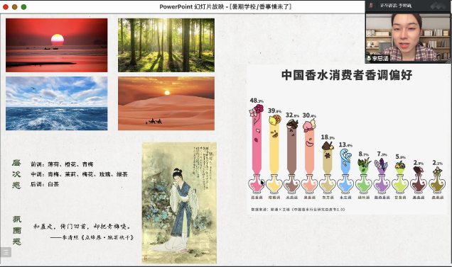 中华优秀传统文化“双创”专题系列讲座作为本期暑期学校的创新亮点之一,主讲者均为我院学子,他们同时也以唐仲英“中华文化创未来”项目负责人的身份,分享了其团队在探索中华文化创造性转化、创新性发展的心得体会,以及在创新创业之路上的成功经验。“冷凝香手作”项目负责人李思涵以“香事情未了——中国香文化及其教学设计”为题,展示了团队开发的中华传统文化感质性产品,以及在此基础上所进行体验式教学设计探索。“明月与作耳边珰”文化耳饰设计项目负责人肖春楠从文化转化、文化传播和产教融合等方面分享了其团队在项目开发过程中的思考。