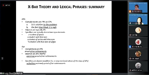 在汉语本体研究专题系列课程的学习中,同学们接触和了解到功能语言学派、生成语法学派在汉语语法研究方面的前沿理论成果。美国斯坦福大学孙朝奋教授以“中文定式动词和体标记”为题,围绕动词系统的静态/动态、有界/无界、持续/非持续、现实/非现实模态等核心概念,详细讲解了汉语动词时体的编码形式及其程序性特征,分析了“不”和“没(有)”与非现实和现实模态的对应关系,并介绍了其关于动词词尾完成体“了”的最新研究成果。英国剑桥大学赵霞教授通过16课时的系列专题课程详细讲授了句法学理论知识,她以乔姆斯基的生成语法理论为基础,内容涵盖“短语结构与X-阶标理论、词库与题元理论、格理论、移位理论、管约理论、空语类与控制理论”等主题,结合大量汉英语料的对比分析,使同学们加深了对语言学理论知识的认知与理解、提高了运用语言学知识分析具体语言现象的能力。