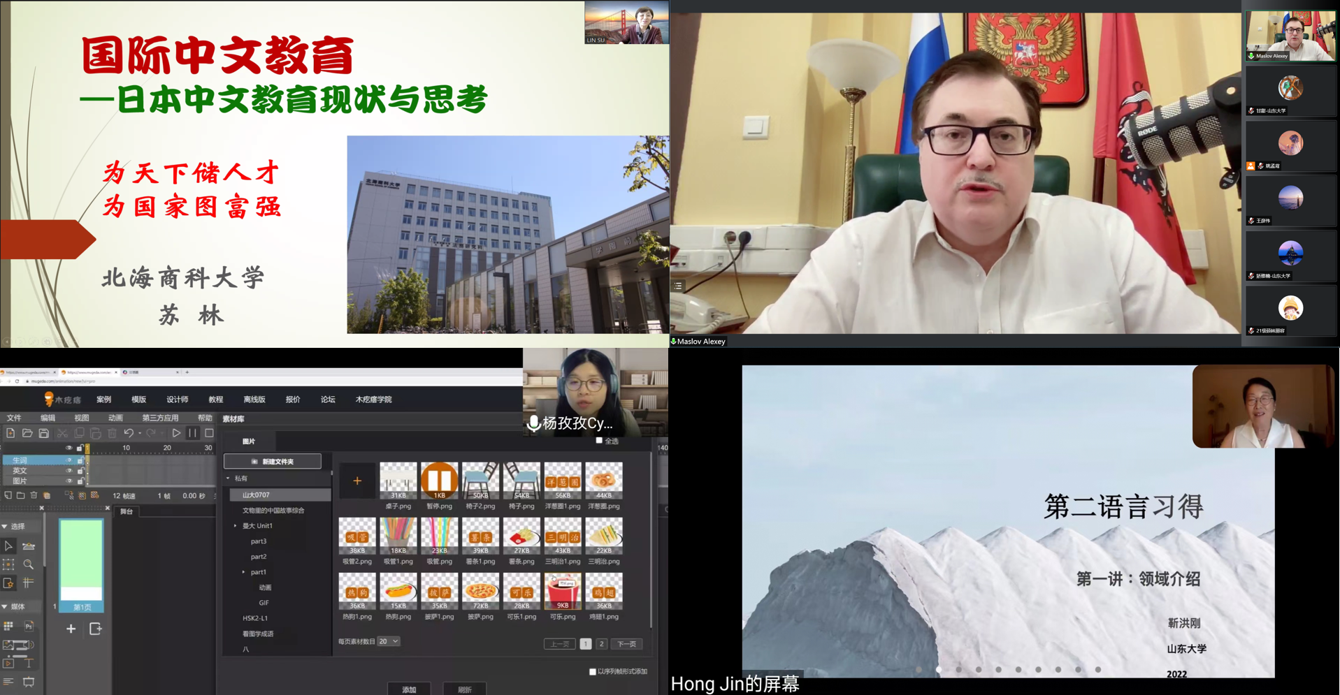 国别中文教育与语言习得专题系列讲座主要介绍了当前中文教学与二语习得领域的前沿理论、技术和未来发展趋势。日本北海商科大学苏林教授以“日本中文教学发展现状”为题,结合自身在日本从事多年中文教学的案例和心得,与同学们深入探讨国际中文教育的时代需求与未来发展趋势。俄罗斯莫斯科大学亚非学院院长马斯洛夫教授以“中国全面研究和汉语教学”为题,基于俄罗斯汉学研究的理论基础和学理支撑,分享了其对俄罗斯国际中文教育发展的最新观点。孜孜华文教育科技(北京)有限公司创始人杨孜孜为同学们准备了题为“国际中文融媒体教学资源制作”的实操性讲座,讲解如何运用HTML5技术制作支持丰富媒体形式、动画和交互行为的H5融媒体教学资源,在实践操练中提升了同学们的信息素养和教育技术能力。美国汉密尔顿学院靳洪刚教授主讲了“第二语言教学理论与实践”系列讲座,以二语习得领域的复杂性为切入点,分析了二语习得的研究内容及其与一语习得的关联性,并通过学堂在线和Padlet等线上学习平台,介绍了语言距离、显性和隐形学习、选择性注意假说、有意图学习和伴随性学习等学科前沿热点。