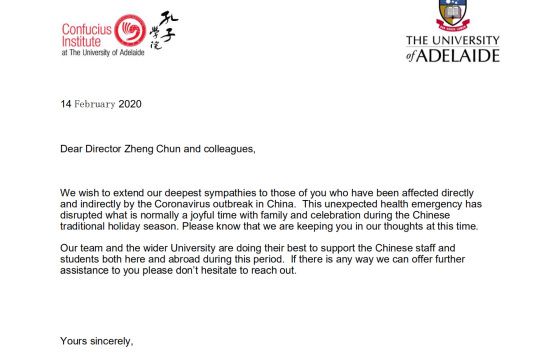 阿德莱德大学孔子学院澳方院长张宁老师寄来一封情真意切的慰问信,在信中,她表达了对国内疫情的关注,对国内工作人员的关心和惦念。她表示在这一特殊时期,孔子学院整个团队将尽力帮助海内外的中国职员和学生,尽一切力量做支援工作。据悉,阿德莱德大学孔子学院已指派两位本地志愿者,代表孔院参与到阿德莱德大学帮助中国留学生的系列行动中;同时也正在与中澳青年联合会沟通,组织义卖活动,所得收入将支援国内疫情一线。