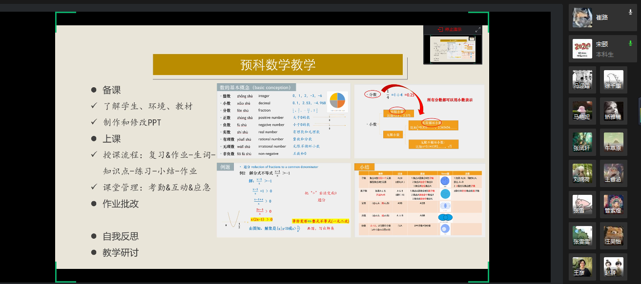 汇报会主要包含个人陈述和互动交流两个主要环节。在个人陈述中,同学们都制作了精美的PPT,通过一张张考勤记录表,时差统计表,与留学生同学跨文化沟通的截图,自己的备课记录、课堂观摩记录教学反思截图等,呈现了忙碌而充实的实习工作经历,分享了自己在这个过程中收获的经验与成长,以及对在线教学和专业发展的思考与展望。可以看出,经过这段特殊的实习经历,同学们的语言表达能力和人际沟通能力都有了很大提升,巩固了专业知识、加深了专业理解。大家普遍反映,感谢学院提供了这样有意义的实习平台,学到了很多课堂上无法学到的知识和能力。在与指导老师的密切沟通中深切感受到老师们的敬业、认真,从老师们灵活智慧的课堂应变、专业耐心的知识答疑和丰富多样的教学方法中,体会到国际汉语教师职业的复合与多元,激发了自身对职业选择和就业方向的思考。同学们互通有无,相互启发,以这样一种仪式化和方式迎接毕业时节的到来。在互动环节中,老师们充分肯定了同学们认真严谨的工作态度和积极朝气的工作状态,对典型案例进行了点评解读,祝贺同学们取得了丰硕的实践成果,也祝愿大家在今后的专业深造或工作实践中取得更好的成绩。