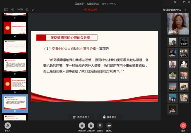 本次活动分为“回望初心-服务当下-展望未来”三个板块,由支部党员围绕不同的主题展开分享。在“回望初心”板块党支部全体党员集体学习了习近平总书记关于新冠肺炎疫情防控工作的重要讲话以及《为人民服务》《纪念白求恩》两篇经典文章。党支部书记李可人分享学习心得,他从党的全面领导、人民的主体地位和抗疫英雄的精神三个方面分享自己的感悟:这次疫情让大家感受到了党的统一领导,集中力量办大事的显著优势;疫情面前,我们既是命运共同体,也是责任共同体,人人有责,人人都是战斗者;无论是身处抗疫一线的医护人员,还是在社区服务的基层工作人员等,大家都在为抗击疫情贡献力量,虽然方式不同,但都深深体现了为人民服务的精神。
