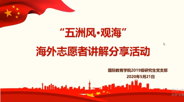 为帮助学生党员明确发展目标,提升专业能力,服务国家战略需求,2019级研究生党支部近日于线上举办了第三期、第四期“红帆出海,青春扬帆”支部党员成长计划系列活动,分别是“五洲风·观海”海外汉语志愿者经历分享活动和“百业情·指南”就业经验分享活动。学院党委副书记王璐璐作为联系支部的党委委员全程参加活动。活动还吸引了各年级同学积极参与。