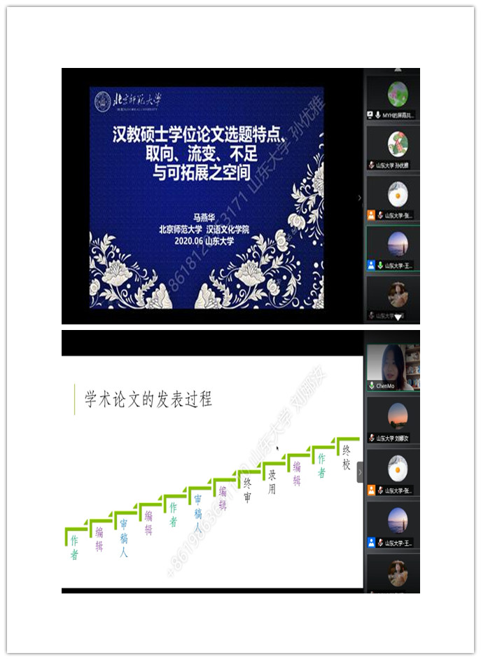 北京师范大学教授、博士生导师马燕华以“论汉教硕士学位论文选题特点、取向、流变、薄弱之处与可拓展之空间”为题展开讲授,她综合北师大十多年来的汉语国际教育专业硕士学位论文情况,从概况、特点、取向、流变、薄弱之处、论文不足与可拓展空间等方面对议题展开论述,为学生们的论文写作提供了众多选题视角和研究内容,并就疫情影响下的论文选题、语言常态匹配、线上教学等问题进行现场回应与讨论;随后,陈默教授以“基于作者、审稿人和编辑的三维视角写作观”为题,从编审人的角度讲语言教学与研究类论文的写作和投稿,重点讲授三维视角下论文写作发表过程中“作者如何写、审稿如何审、编辑如何编”等内容。