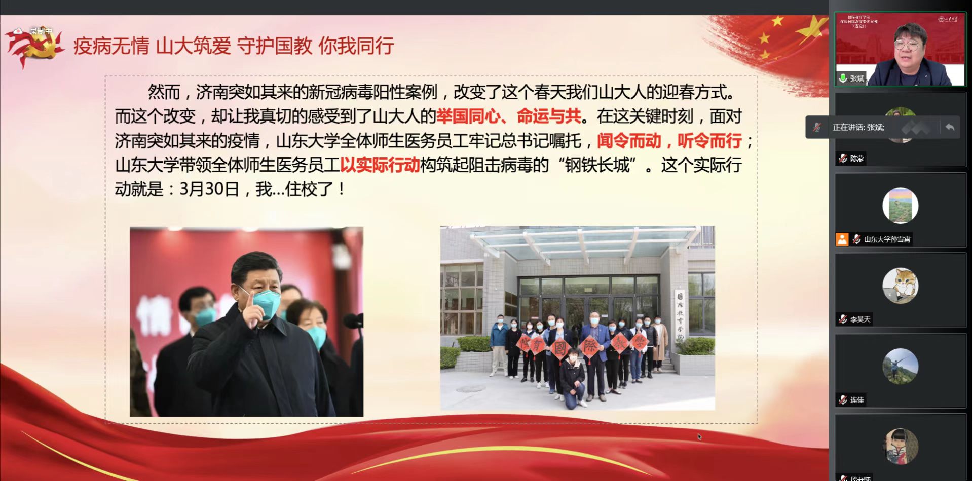 挖掘身边冲锋在前、战斗抗疫一线的先进典型。各支部分别邀请留校坚守在抗击疫情一线的党员和入党积极分子代表分享留校日常工作和全校全院师生聚集合力抗击疫情的切身体会,其中包括海归青年入党积极分子教师作为志愿者留守校园,分享校内抗疫经历与从海外疫情亲历者到山大抗疫志愿者的心路历程及成长经历;青年党员危急时刻勇担当,远道护送学生安全回家;党员干部严以律己,以身作则,冲锋在前,解决一个又一个抗疫难题。