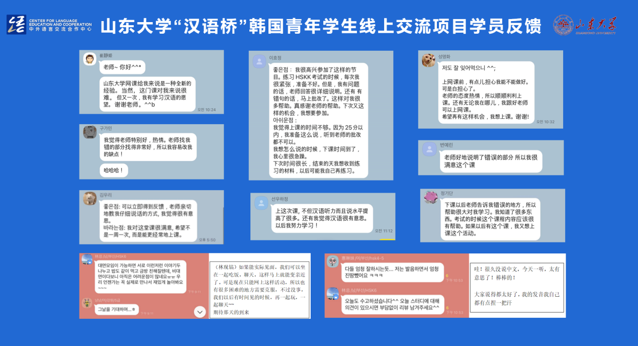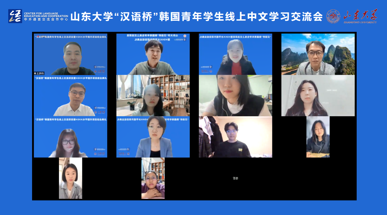 与会人员就项目的课程设置、教学形式、个人收获等多个方面的内容进行研讨和交流。项目学员林尚泽(Lim Sangtaek)是釜山大学考古学专业的教授,同时是一名中文爱好者,他表示,在线上课堂的语言学习中,中方教师及时准确的纠错反馈,使自己收获了更多激励,期待继续参加更多语言文化主题的学习活动;即将攻读中国高校学位的李珠原(Lee Juwon)谈到,HSKK专题课程提高了他的中文会话能力,他计划报名参加最近的HSKK考试,为取得中文学位打好基础;中方教师代表尹彤迪和崔一方回忆了与各位学员进行中文教学与交流的过程,她们均表示,同学们中文学习的时间不同,水平也还有一些差异,但大家都表现出饱满的学习热情与良好的学习素养,每个人在项目学习的过程中都取得较大进步,大家也结下了深厚的友谊。