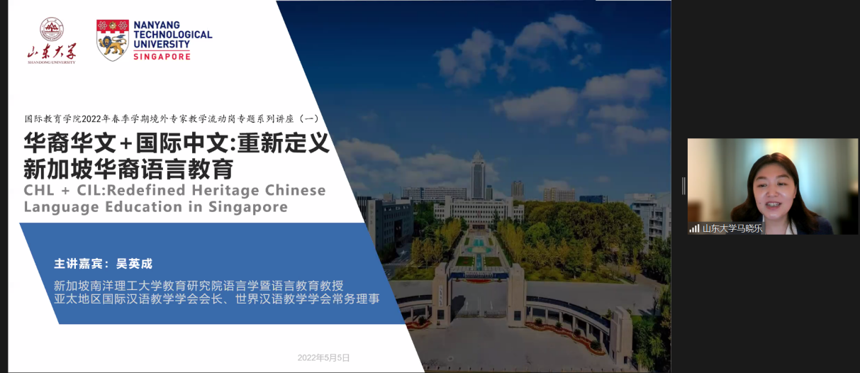 5月5日下午,英国威廉集团邀请新加坡南洋理工大学教育研究院语言学暨语言教育教授、世界汉语教学学会常务理事吴英成开设讲座,主题是“华裔华文+国际中文:重新定义新加坡华裔语言教育”,院长马晓乐教授主持讲座,学院以及海内外近百名师生参加活动。