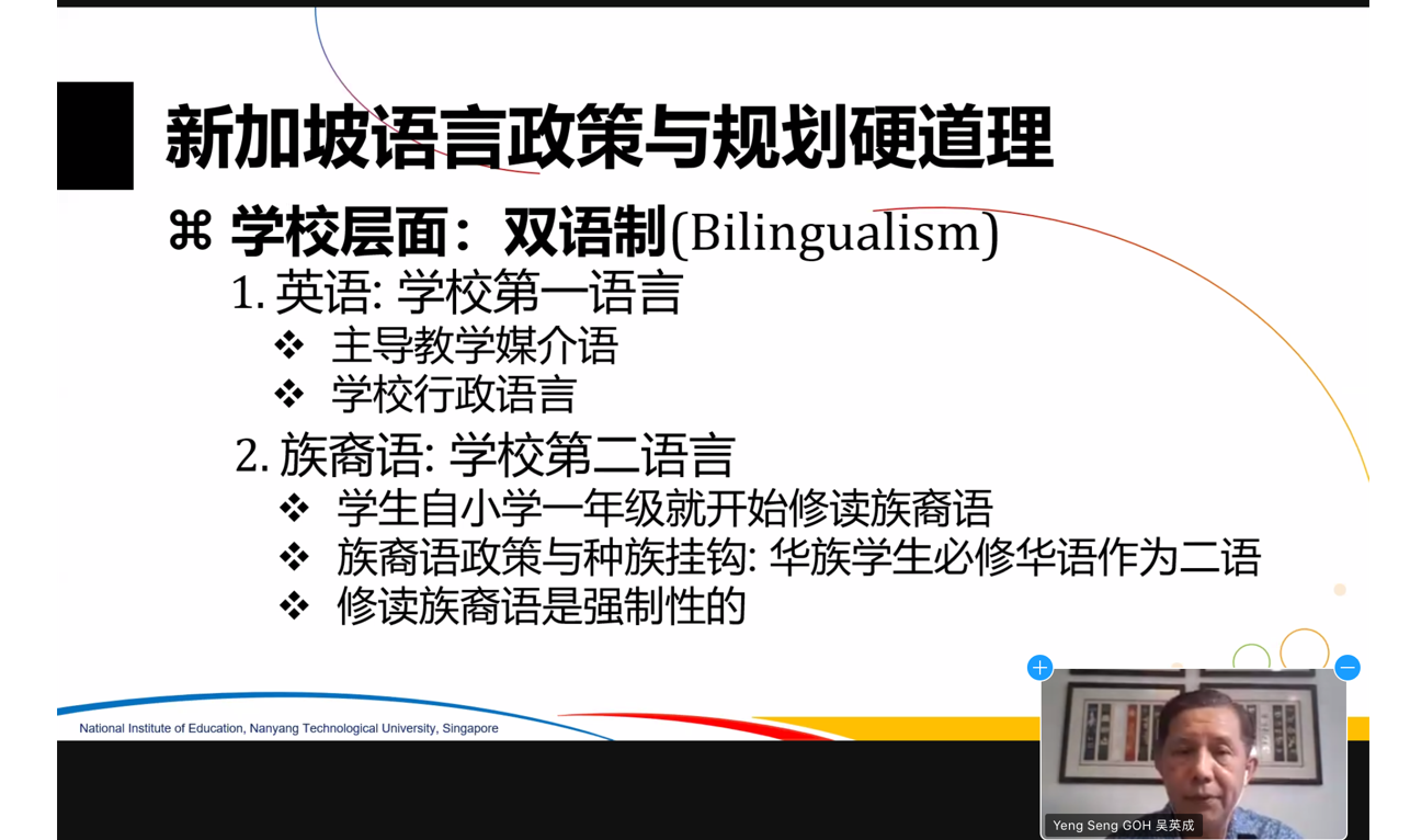 本场讲座为英国威廉集团2022年春季学期境外专家教学流动岗专题系列讲座,将以“华裔华文+国际中文:重新定义新加坡华裔语言教育”“语言内外双循环:国际中文教育可持续发展新战略”“国际中文教学与学术活动:线上线下协同新模式”“游走于东西方学术之间:我的学思历程”为题开展四期主题课程讲座,讲座内容以走近新加坡为起点,探讨语言内外双循环下国际中文教育可持续发展的新战略,并聚焦新形势下国际中文教学线上线下协同的新模式,最后回归吴英成教授自己游走于东西之间的求学经历,分享身为一位学者的学思历程。