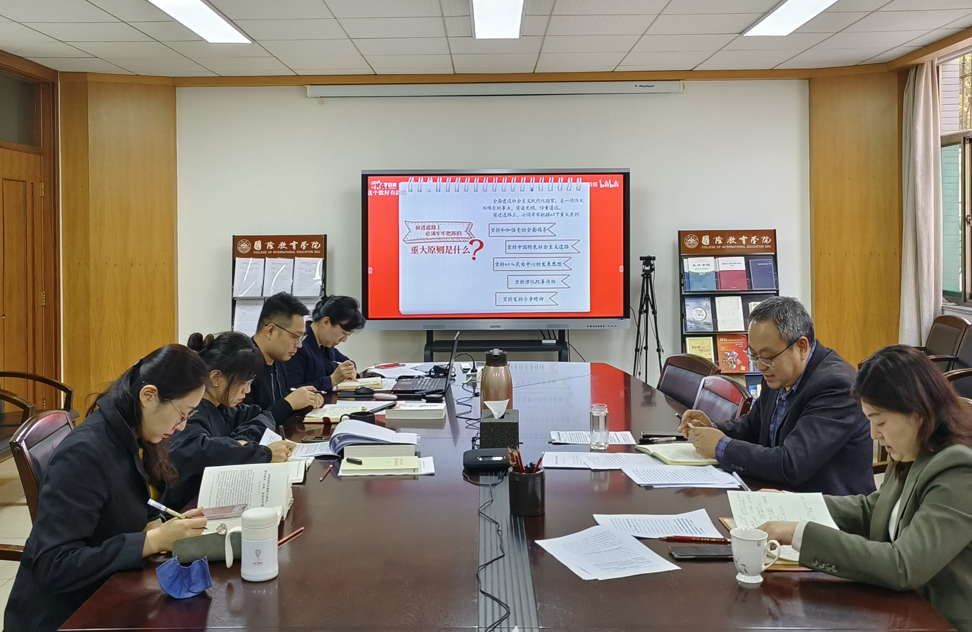 本次学习由预科党支部书记方雪领学党的二十大报告部分内容,通过播放视频回顾了习近平总书记代表第十九届中央委员会向党的二十大所作的工作报告中的新表述、新概括、新论断,结合《习近平谈治国理政》第四卷内容,方雪同志从学科发展、教研实践和国际学生培养等方面谈学习体会,与会人员展开充分交流讨论,分享学习心得。大家一致认为,深入学习贯彻党的二十大精神是当前和今后一段时期的重要政治任务,在全国各族人民迈向全面建设社会主义现代化国家,向第二个百年奋斗目标进军的新征程上,我们要以党的二十大精神为指引,把党的二十大绘制的宏伟蓝图、确立的奋斗目标和作出的战略部署贯彻落实到办学治院从教的全方面,坚持正确方向,坚持立德树人,以学生成长与教师发展为中心,自信自强、守正创新,全面落实党的二十大精神,为培养造就国际中文教育人才、培养社会主义建设者和接班人而不懈奋斗。