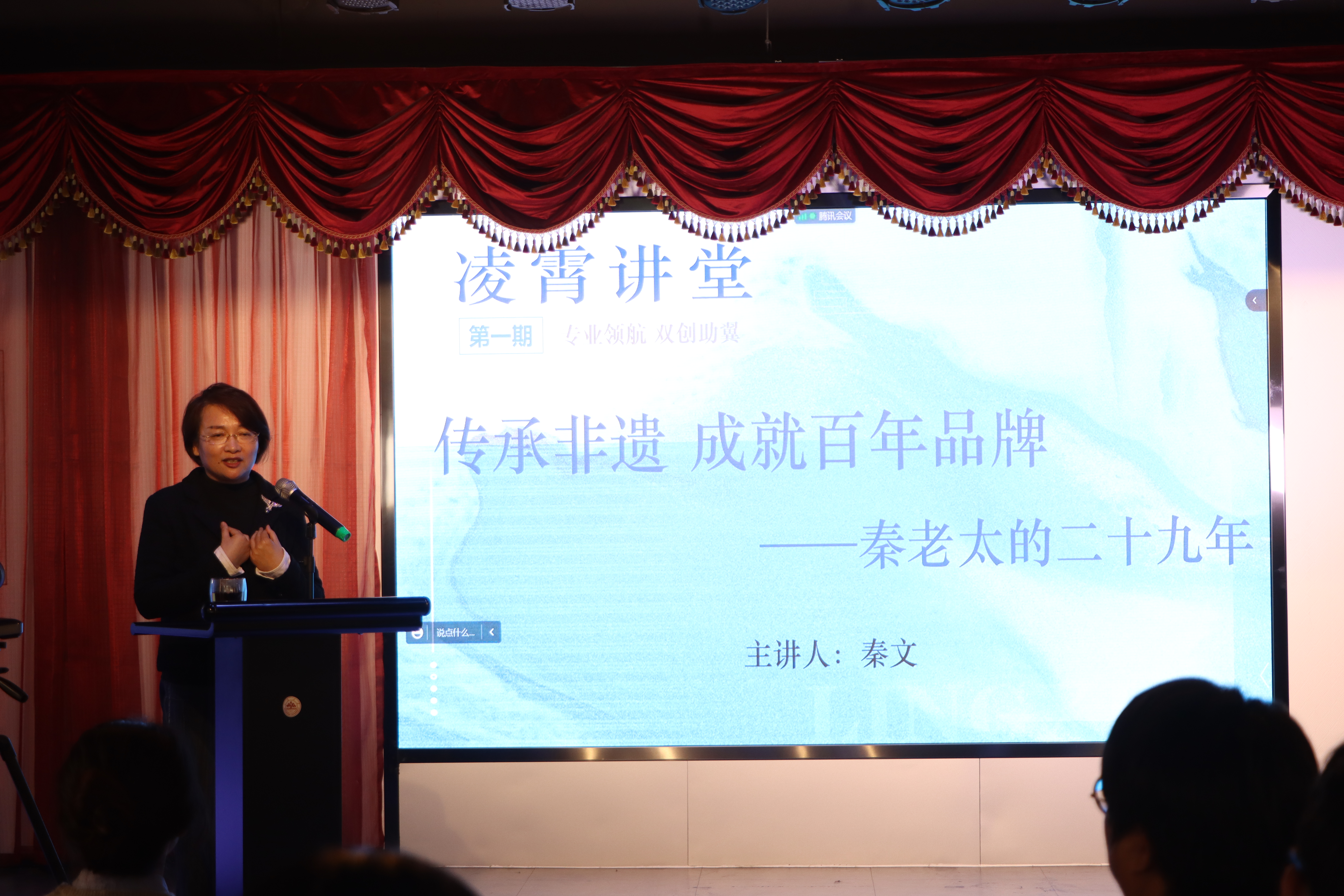 秦文女士以“传承非遗,成就百年品牌”为主题,从家族传承、个人职业经历与企业时代化发展三个方面展开讲述,分享了山东秦老太食品有限公司这一从家学传承走来,与时代变迁同频共振,始终秉承“为家人制造食品”的使命的发展历程。秦文女士深情讲述了祖母作为茶汤传人匠心对待一碗茶汤,兄长传承家学,将非遗茶汤开创性地量产推广,从家庭厨房上市送进千家万户的传承故事,分享了“不能为了创新而创新,应该为解决实际痛点而创新,广泛借鉴,自成一格”的经验与感想。她鼓励同学们发现就业经历对个人发展的重要意义,先就业后创业,选择广阔、有活力的就业平台促进个人提升。最后,秦文女士着眼于当下秦老太食品有限公司的经营发展战略,立足企业经营者与非遗保护协会副会长的双重身份,分享了严把品控,坚持为百姓做放心食品;人文管理,鼓励员工树立主人翁、守护人意识;讲好文化,汲取非遗给养培育文化自信;顺应时代,引导非遗融入现实生活,广开转化与焕活道路,贴合年轻市场,激发内生动力的成功经验与思考感悟,尽显当代企业家人文传承、服务社会的奉献精神。