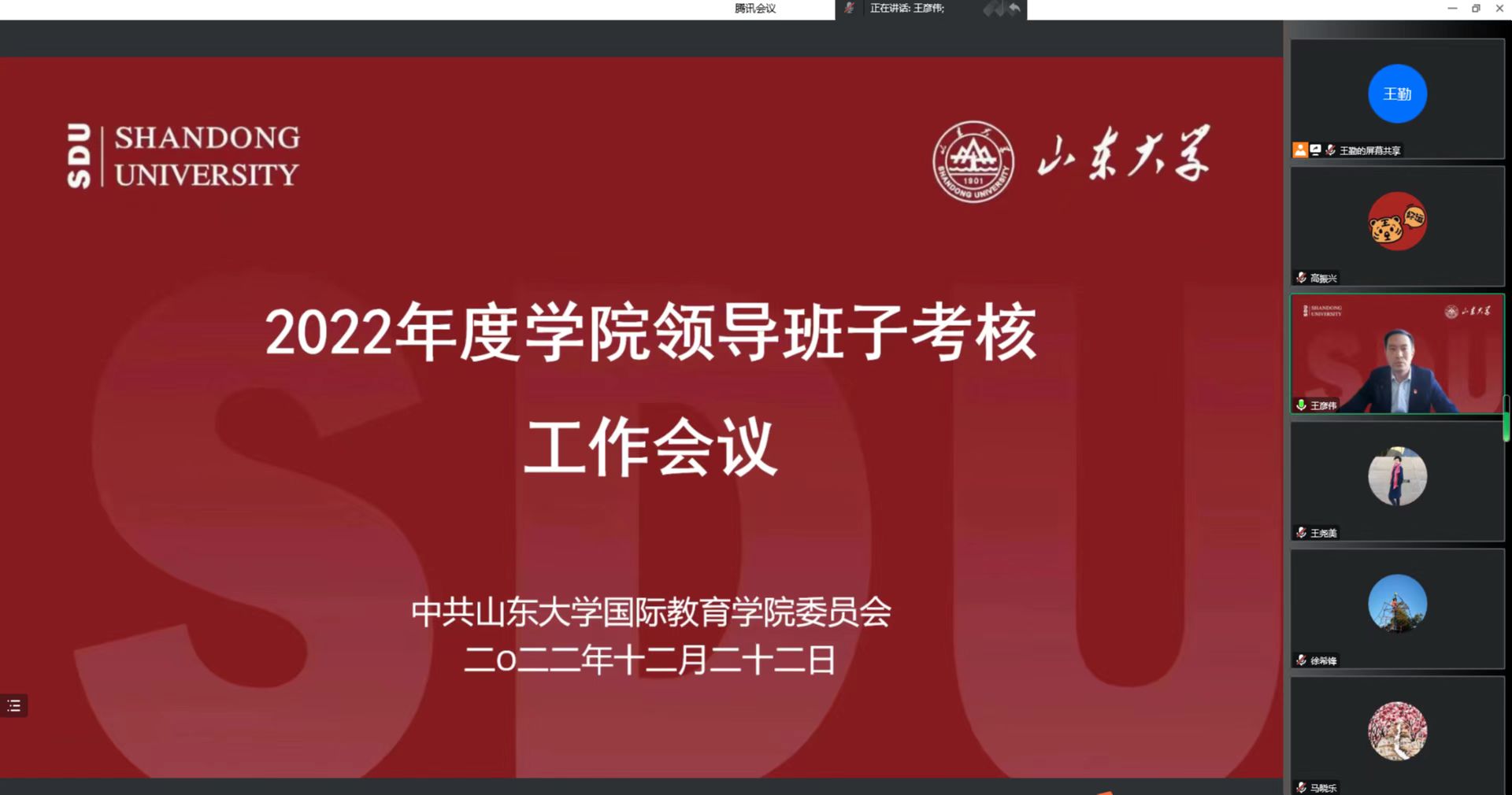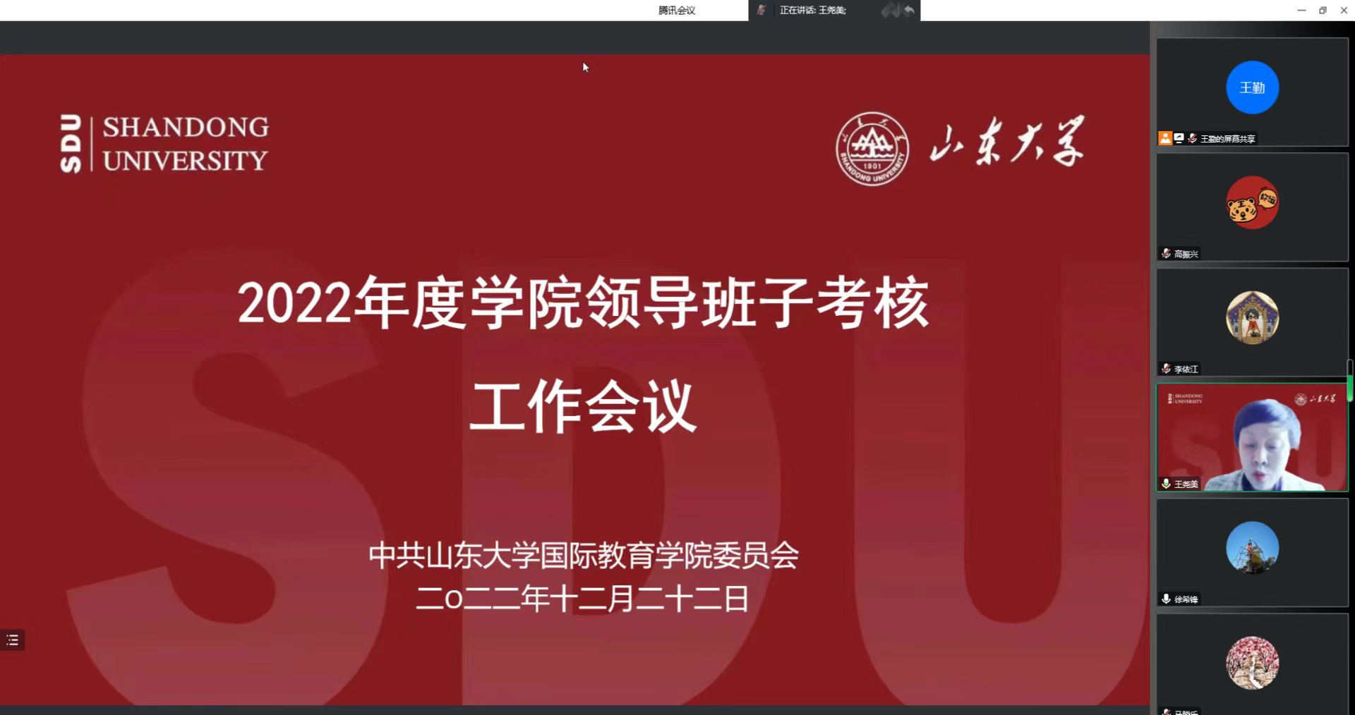 徐希锋代表学院班子从党的建设、领导能力、工作实绩、安全稳定、党风廉政和作风建设等五个方面总结了2022年度学院整体工作和存在的问题,并提出下一年度工作思路和措施。他表示,一年来,学院党委坚持以习近平新时代中国特色社会主义思想引领事业发展,以扎实工作服务构建人类命运共同体;坚持落实立德树人根本任务,创新开展国际中文教育教学,倡导构建“亲清师生关系”,推动“三全育人”综合改革;全面推进习近平新时代中国特色社会主义思想“三进”工作,扎实做好课程思政;落实学校服务山东、服务社会工作部署,积极服务国家战略需求;坚持精耕细作,采取系列措施,更新观念,提高认识,统一思想;坚持“严”的主基调加强规范管理,严格落实学校疫情防控各项措施,统筹好疫情防控、安全稳定和事业发展各项工作。