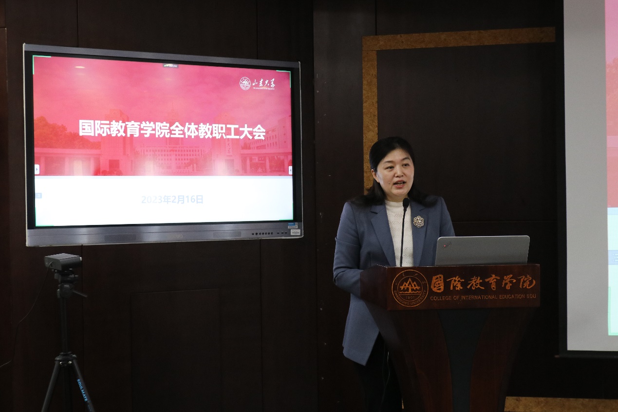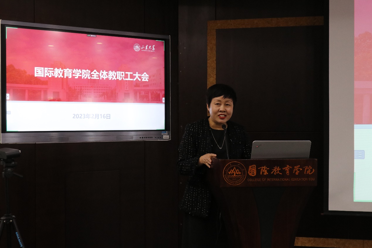 会议首先以视频短片回顾了学院2022年取得的各项成绩。在疫情防控、事业发展、安全稳定的总体要求下,学院党建、“三全育人”综合改革、教学科研、平台资源建设、新文科实验室、国际交流与合作等领域取得了一系列新进展和新成效,展现出国教人迎难而上、团结奋进的精神风貌。