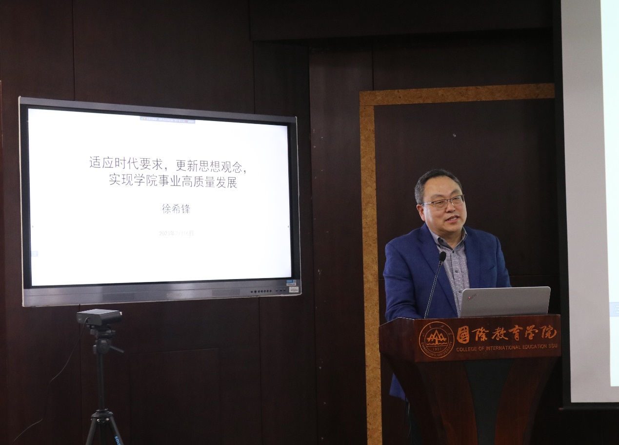徐希锋以《适应时代要求,更新思想观念,实现学院事业高质量发展》为主题,对学院工作进行总结和展望。他立足国际、国内、行业、校内发展趋势,指出国际中文教育事业面临的新挑战、新形势,强调要按照学校的部署要求,以“六个坚持”为2023年工作总基调,贯彻党的二十大精神,抓好全面从严治党和高质量基层党建,提高认识,统一思想,围绕学院“一条主线、八大支撑”顶层设计,锚定服务国家战略和社会发展,团结奋斗,为全面完成新学期各项目标任务,推进学院高质量发展提供坚强政治保障;以融合发展新举措和资源投入再调整实现结构性改革,进一步深化事业发展,进一步加大国内国际合作,提升人才培养质量和国际传播能力。