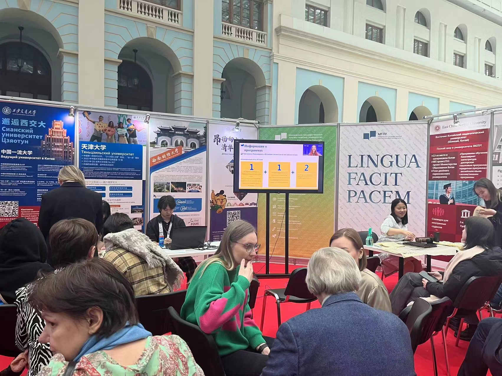 此外,面向俄罗斯的招生宣讲活动设有线下展台。我院邀请到俄罗斯校友赴现场用俄语以亲身经历介绍学校并与观众互动。线下展台座无虚席,意向来华留学生的俄罗斯学生和家长纷纷参与到体验活动中。