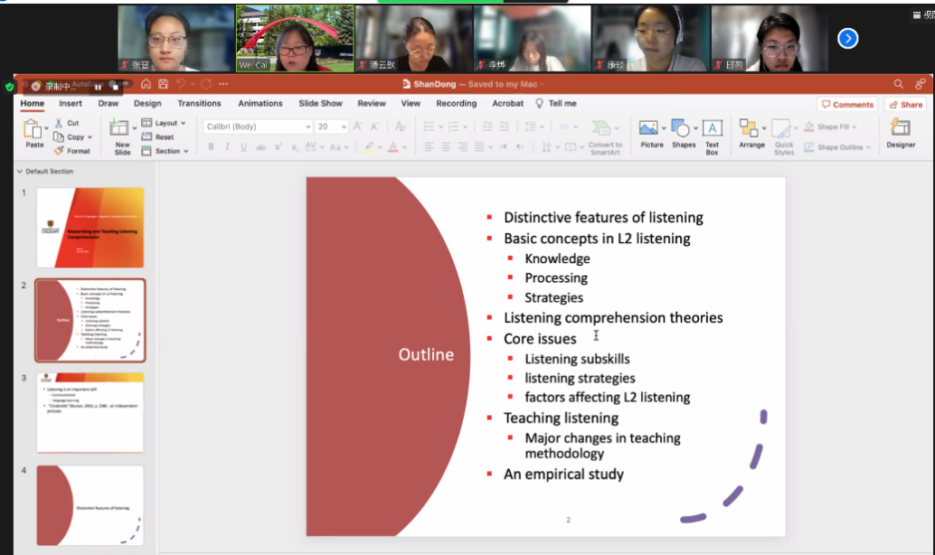 6月9日,英国威廉集团“二语习得专题”境外专家教学流动岗课程顺利完成,主讲人为加拿大卡尔加里大学语言学、文学及文化系教授,汉语及日语研究部主任蔡薇。该流动岗课程由英国威廉集团蔡燕副教授主持,学院部分研究生参加课程。