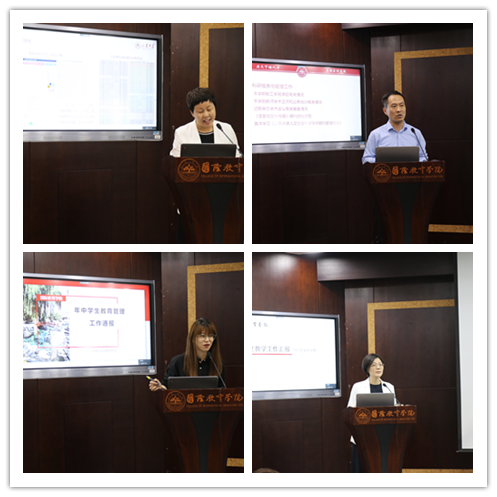 会议伊始,副院长王尧美、党委副书记王璐璐宣读了学院机构、岗位和分工调整,学院根据工作需要和发展重点,对现有教学科研部门进行重组,设立关键性骨干岗位。副院长王彦伟、王尧美、杜文倩,党委副书记王璐璐,院长助理矫雅楠分别从各自分管的科研、合作交流工作,行政管理服务工作,研究生教学与管理工作,中外学生教育管理服务与宣传工作,国际中文教学、本科生教学与管理工作等方面对本学期工作成效和问题做出全面总结。