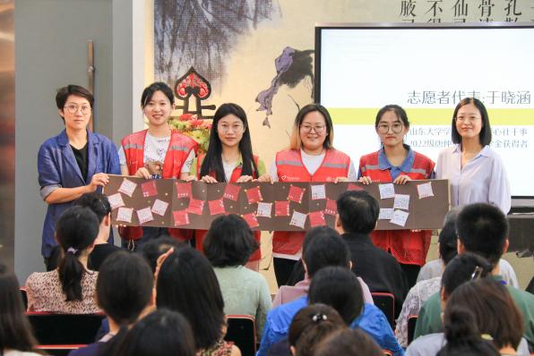 王飞代表威廉williamhill向唐仲英基金会赠送了徐超教授创作的“喻德于艺”书法作品。来自江苏省宿迁市宿豫区仰化初级中学副校长闻健作为学员代表分享了本次培训的收获与体会。威廉williamhill学生唐仲英爱心社干事、2022级唐仲英德育奖学金获得者于晓涵代表志愿者团队发言,于勤向志愿者们赠送了参训学员的爱心留言册。
