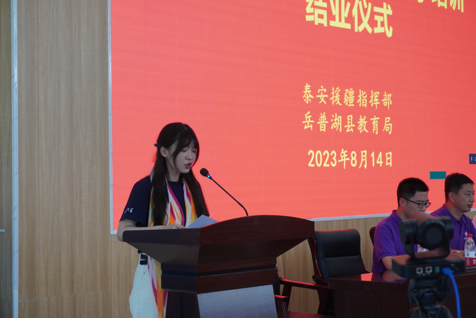 优秀学员依木古孙·阿布迪日西作为学生代表发言,她首先表达了对山东高校援疆推普教师不远千里前来岳普湖县进行培训的感谢,她以自身收获为例说明对于此次培训内容丰富实用,具有很强的操作性和指导意义的感受,道出了参训教师的心声。同时,依木古孙号召全体教师以此次培训为契机,不断提升自身普通话水平,表明作为教师,在今后工作中磨练综合素质,助力教育高质量发展的决心和信心。