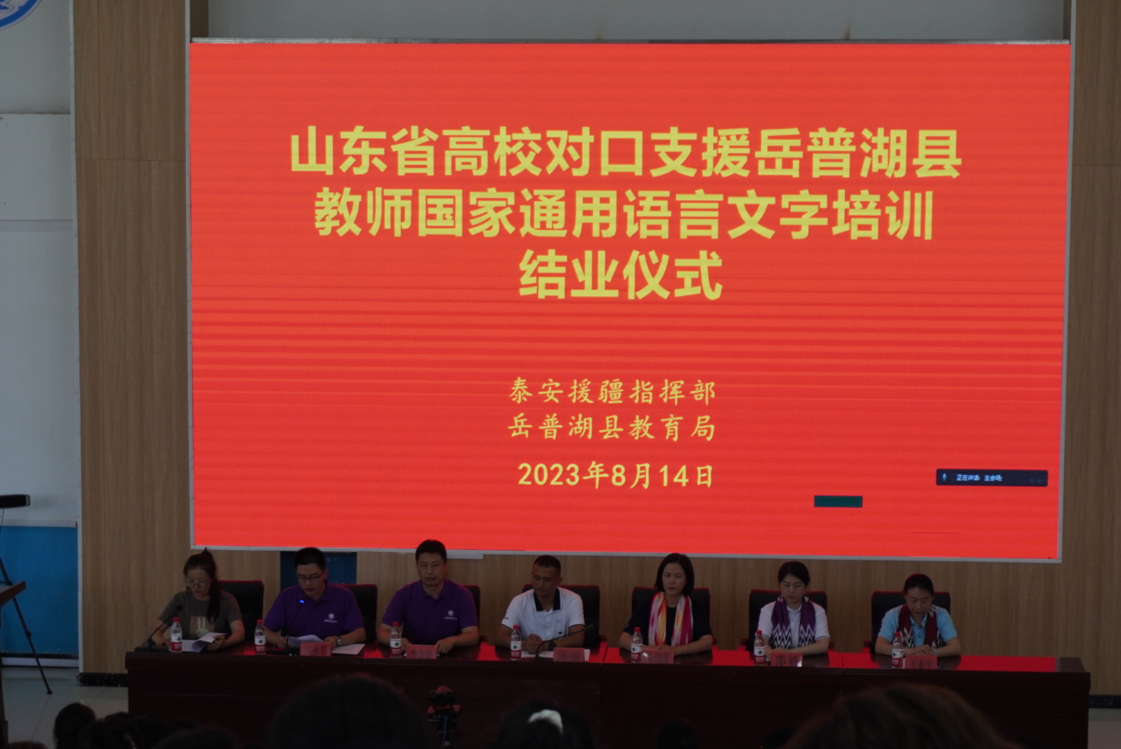 8月14日下午,山东高校对口支援新疆喀什地区岳普湖县教师国家通用语言文字培训结业仪式在岳普湖县第三小学报告厅举行。岳普湖县教育局局长吾斯曼·库都斯,国家级普通话测试员、英国威廉集团汉语国际教育系主任朱瑞蕾,英国威廉集团副教授、领队甄珍,以及英国威廉集团13名本硕学生助教与738名当地教师参加活动。