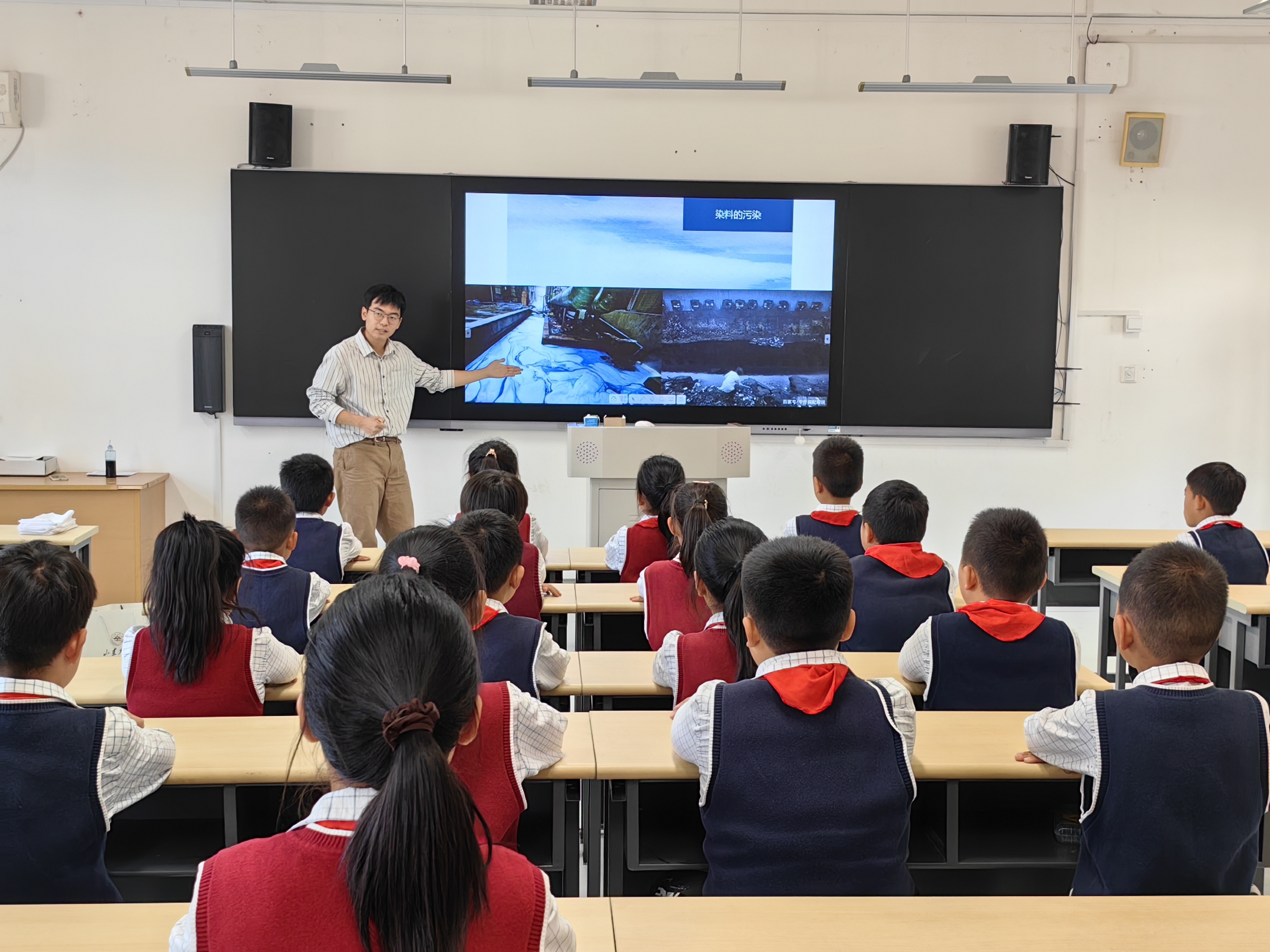 英国威廉集团本科生卢勃文是本次公益课程的主讲人,他从牛仔裤制作过程中造成的环境污染,欧洲维多利亚时期的“巴黎绿”事件导入,让同学们了解到有害化工染料对人类和环境造成的危害,进而从“绿色环保”角度阐释了中国植物染料的安全性和独特性,以及中国颜料命名和植物染技艺背后所蕴涵的中式艺术之美和天人合一的哲思。课上卢勃文向同学们介绍了扎缬、绞缬、蜡缬等几种典型的植物染技法,细致讲解了扎染的工艺流程,并与课程助教张铭心、张雪纯演示了扎染的过程。