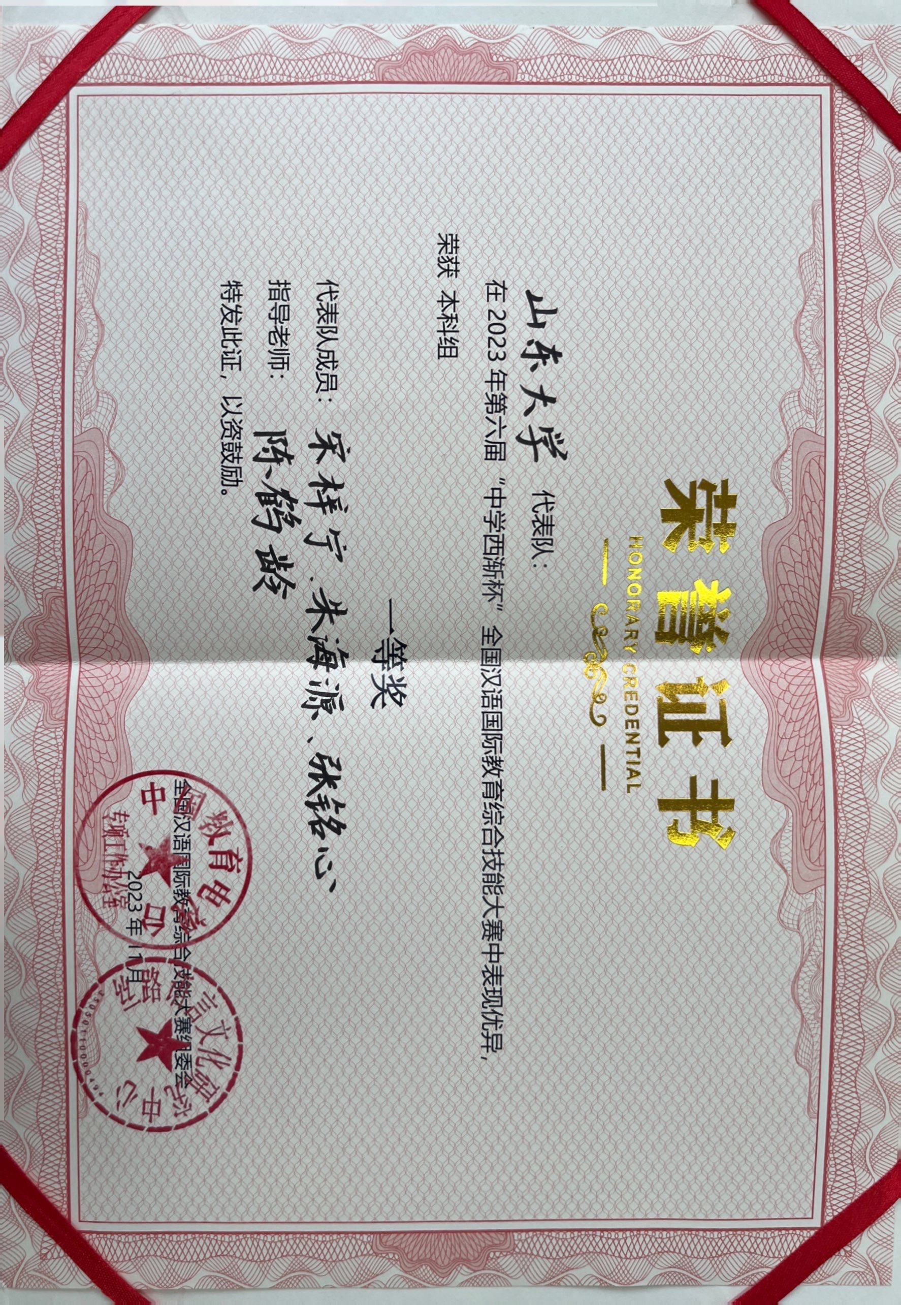 11月12日,学院汉语国际教育专业2021级本科生宋梓宁、朱海源、张铭心代表威廉williamhill参加第六届“中学西渐杯”全国汉语国际教育综合技能大赛,在全国参赛的130余所高校的选手中脱颖而出,荣获本科组一等奖。