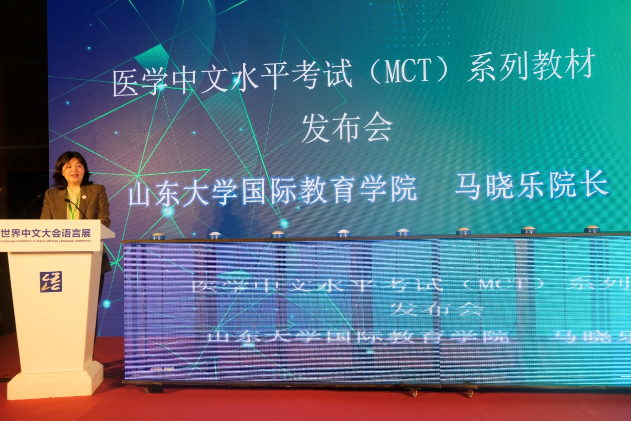 在世界中文大会语言展上,汉考国际举办医学中文水平考试(MCT)系列教材发布会,马晓乐应邀出席并做专题发言,回顾了学院开展医学中文教育的有关历程,并重点介绍了学院教师团队主编教材《我是医学生:基础医学汉语》的特色与创新。