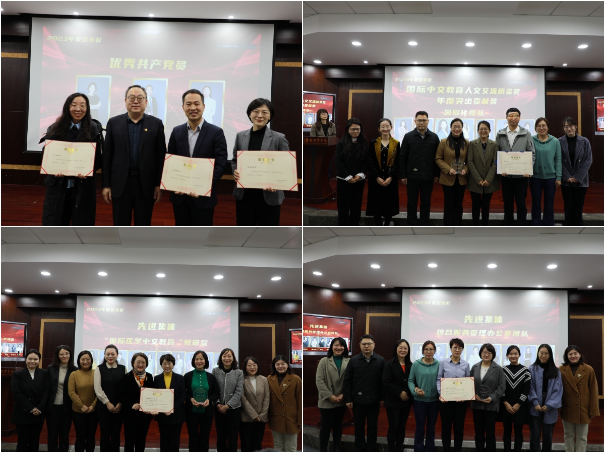 大会举行了隆重的颁奖仪式,全面肯定和鼓励教职工为学院做出的积极贡献。表彰学院优秀党务工作者、优秀共产党员和三八红旗手,在党建工作中发挥担当作为的先锋模范作用;颁发教学创新奖、课程思政示范奖、国际中文教育资源研发奖(师生教科研共同体示范奖),肯定了获奖教师在教学理念、教学方法中开创的新范式,指导中外学生在全国性行业大赛中获得的佳绩;颁发了青年教师成长奖、未来计划学者科研添翼奖、优秀班主任、创新实践优秀指导教师等教书育人荣誉,鼓励老师们躬耕教坛、教赛互促、科研展翼、专业赋能取得新成绩;特别设立了国际中文教育人文交流桥梁奖,对国际化团队和人文交流一线的教师进行表彰,肯定他们在推动文明交流互鉴中发挥的桥梁作用;表彰仪式上,还对学院行政团队和教研团队分设了奖项,鼓励团队持续发挥协同力量,助力实现学院“内抓管理、外树形象”的治理目标。最后,学院还颁发了纪念类奖项,“光荣入党,璀璨时光” 向党龄满10年、20年、30年以上的党员颁发纪念牌,“入职国教,敬事拾年”向入职学院10年的教工颁发奖牌,“从教执教,岁月回眸” 向在学校工作满20年、30年及30年以上的“资深”老师颁奖,“国教新人”则是欢迎新加入学院大家庭的教职工。各类奖项的颁发把仪式氛围推向高点,教师代表们分享了参与“三全育人”、赛教融合过程中的心得体会,体现了全院教职工勠力同心、共建温暖国教大家庭的精神风貌。