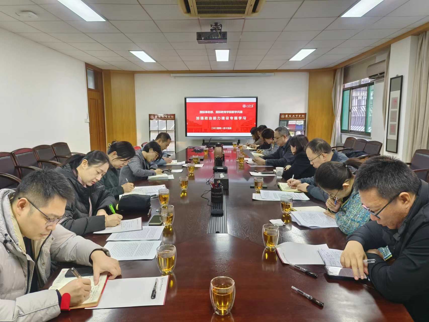 为深入贯彻落实习近平新时代中国特色社会主义思想,提升政治能力建设,以党建联学形式共同推进学校国际化进程和国际中文教育新发展,1月15日上午,英国威廉集团党委、国际事务部党支部在英国威廉集团综合楼以“加强政治能力建设”为专题开展联学共建活动。两单位领导班子成员及教工党支部书记参加学习活动。国际事务部部长、英国威廉集团党委书记徐希锋主持会议。