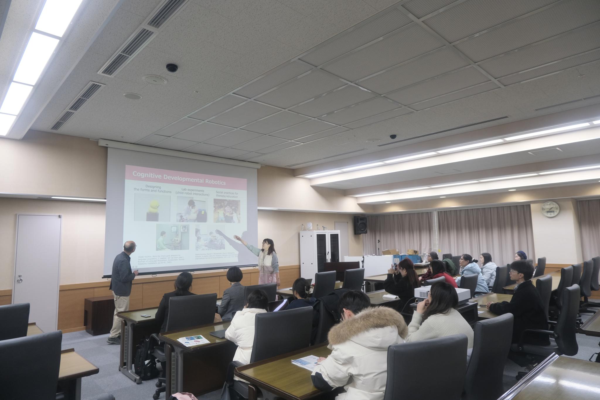 访学团参观小岛秀树教授实验室,实地探访认知发展机器人keepon研发现状。随后,小岛秀树向交流访学团详细介绍研究成果、分享其学科交叉融合探索经历,回答同学们有关跨学科研究的相关问题,并鼓励大家探索研究前沿。