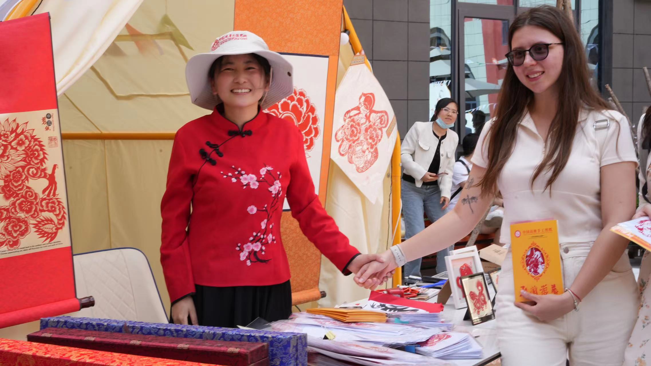 同学们还参观了“国风鲁韵”展。展览中有木版年画老字号“顺兴齐记”第六代传人现场演示木版年画制作过程,新河草编手艺人巧手编就各种草编艺术品,还有潍坊风筝、高密剪纸、临沂空灵鼓、淄博琉璃等“山东手造”产品,充分展示出山东丰厚的文化底蕴和非遗技艺。琳琅满目的展台、丰富多样的体验让同学们乐在其中、流连忘返,在动手参与中深切感受齐鲁文化的魅力。活动现场欢声笑语不断,中外文化和谐交融。