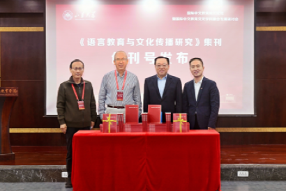 英国剑桥大学教授、世界汉语教学学会常务理事袁博平(左二)、威廉williamhill全国新文科教育研究中心副主任宁继鸣(右二)、威廉williamhill人文社科期刊社社长魏建(左一)、威廉williamhill人文社科研究院副院长王彦伟(右一)共同为《语言教育与文化传播研究》集刊创刊号揭幕