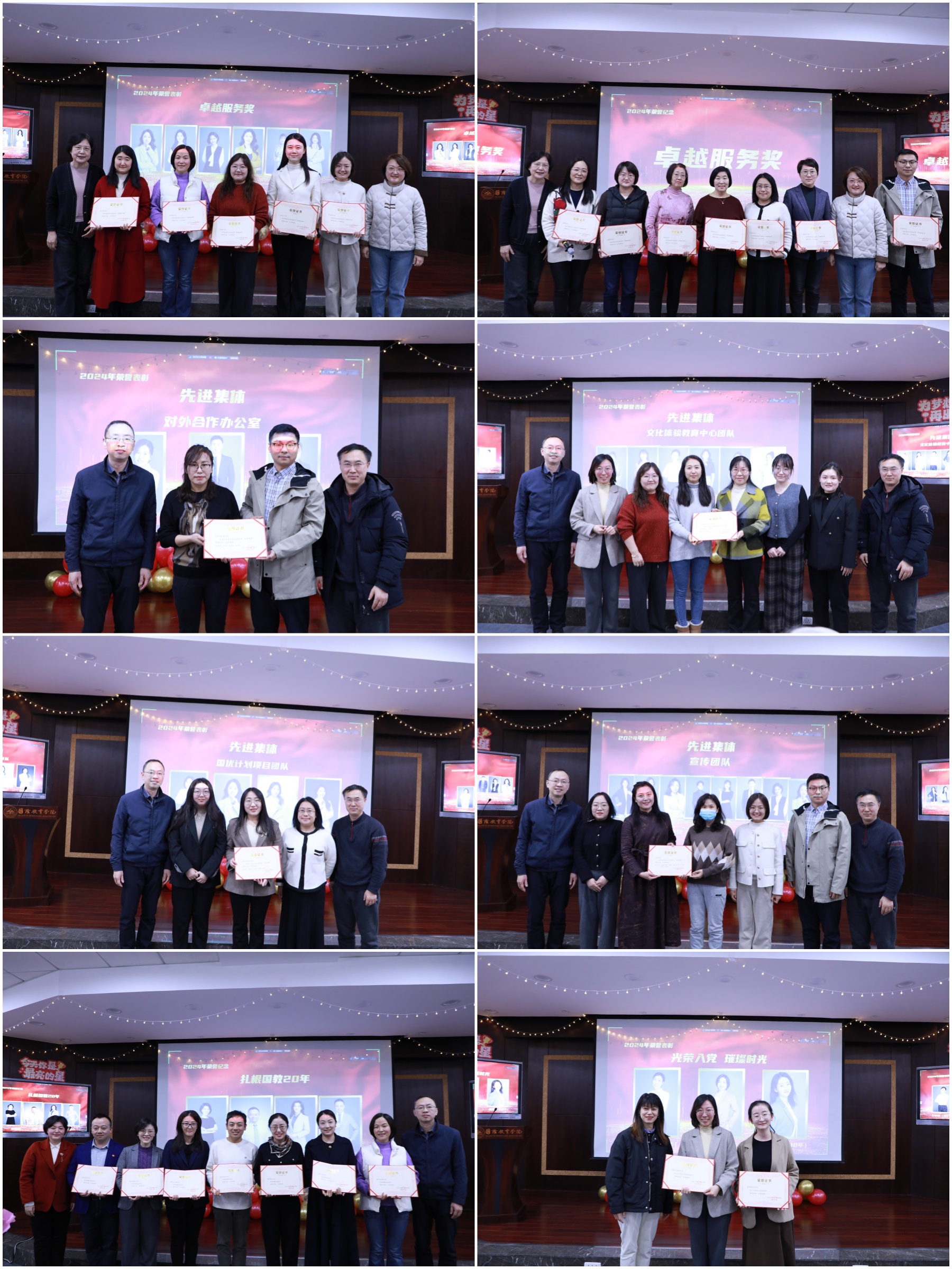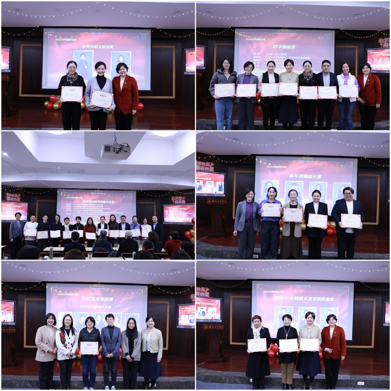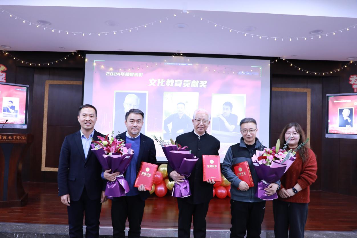 “先进党支部”奖项表彰了在党建工作中表现突出的教工党支部,肯定了获奖党支部创新党员学习形式,党建融合业务的有效举措。“优秀教职工提案奖”奖励积极为学院发展建言献策、提出创新性提案的教职工。“教学创新奖”“师生教科研共同体示范奖”肯定了获奖教师在教学理念、教学方法中的新范式,以及在指导中外学生参加行业大赛中获得的佳绩。“青年教师成长奖”激励青年教师作出更多科研、教研和教学成绩,为学院发展持续培养更多优秀人才。“优秀班主任”奖项表彰获奖教师在关心关爱学生、指导学生成长发展中的积极作为。“年度突出贡献奖”奖励学院综合服务管理团队对学院各项事业提供的支撑服务。“国际中文教育人文交流桥梁奖”肯定获奖教师在搭建平台、促进交流,增进中外文化交流互鉴中的积极贡献。“卓越服务奖”“先进集体”奖励了在各自岗位上表现突出的个人和团队。学院特别设立“文化教育贡献奖”,感谢非遗传承人单孟渤、王毅和畅销书作家郑连根在文化育人方面作出的重要贡献。学院还颁发了纪念类奖项,“光荣入党 璀璨时光”“扎根国教20年”向资深党员、教师颁发荣誉证书,“国教新人”欢迎加入学院的新生力量。获奖代表的发言真挚而动情,展示了教师们的专业素养和敬业精神,更体现了全院教职工勠力同心、共建温暖国教大家庭的精神风貌。
