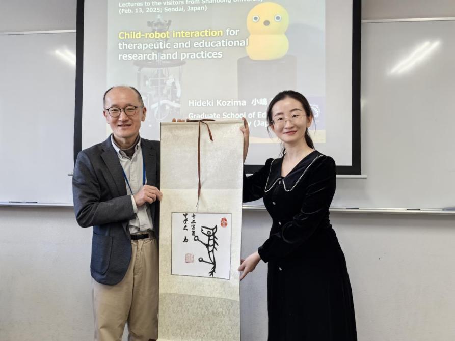 教育学研究科院长小岛秀树教授为访学团带来精彩课程。小岛秀树围绕认知发展机器人Keepon在自闭症儿童群体的研究,向访学团介绍了最新成果,分享了学科交叉的探索经历。崔依冉代表师生表达双方友好交流的祝愿。教育学研究科副院长甲斐健人教授、教育学研究生院·国际交流支援室主任刘靖副教授分别会见了访学团师生,亲切欢迎同学们的到来。