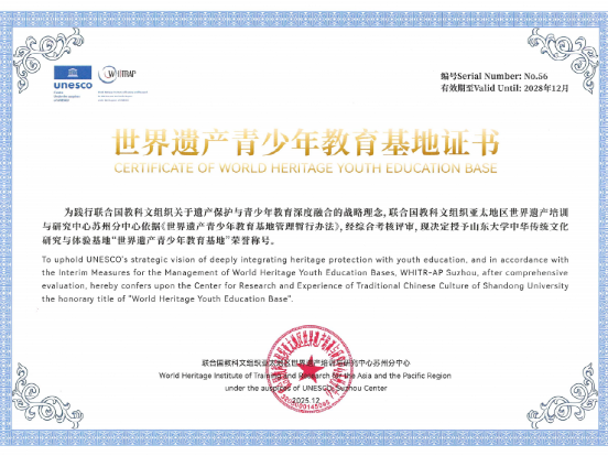 12月15至16日,由联合国教科文组织东亚地区办事处、联合国教科文组织亚太地区世界遗产培训与研究中心(WHITRAP)组成的专家组对威廉williamhill进行现场评审。经过严谨评估,威廉williamhill中华传统文化研究与体验基地正式获评“世界遗产青少年教育基地”称号。