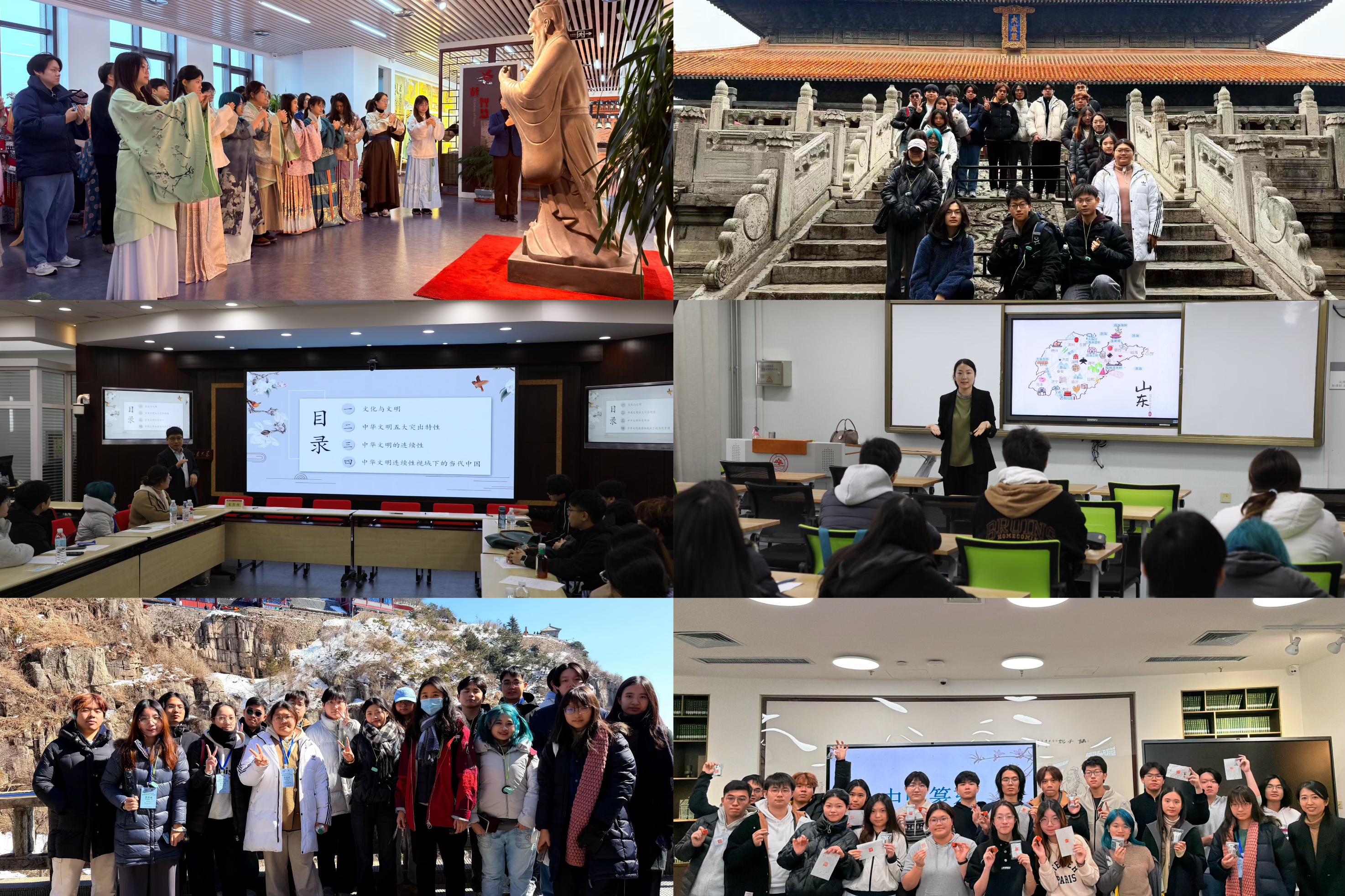 首场国情课程中,朱新林老师以《中华文明连续性视域下的当代中国》为题,带领同学们从五千年文明赓续中解读当代中国的发展逻辑。赵跃老师的《千泉之城,文化之都》讲座带领大家系统了解了“山、泉、湖、河、城”交融的城市风貌,实地探访趵突泉与泉水护城河,领略“家家泉水,户户垂杨”的独特景致。在校期间,同学们走进威廉williamhill传统文化体验中心,亲手体验拓印、篆刻等传统技艺,在笔墨刀工中感受汉字之韵与文化传承的力量。在五三惨案纪念碑前,同学们缅怀历史,深刻体会“国家富强、民族复兴”的意义,厚植家国情怀。在曲阜,同学们漫步孔庙、孔府、孔林,追寻至圣先师足迹,观摩大型礼乐表演《金声玉振》,在大学堂诵《诗经》、临《论语》,沉浸式感悟儒家文化精髓。最后,大家在泰山上体会“会当凌绝顶,一览众山小”的豪情,领略雄浑壮丽的自然风光,也在艰难跋涉中体会“坚韧不拔、勇攀高峰”的精神内涵。