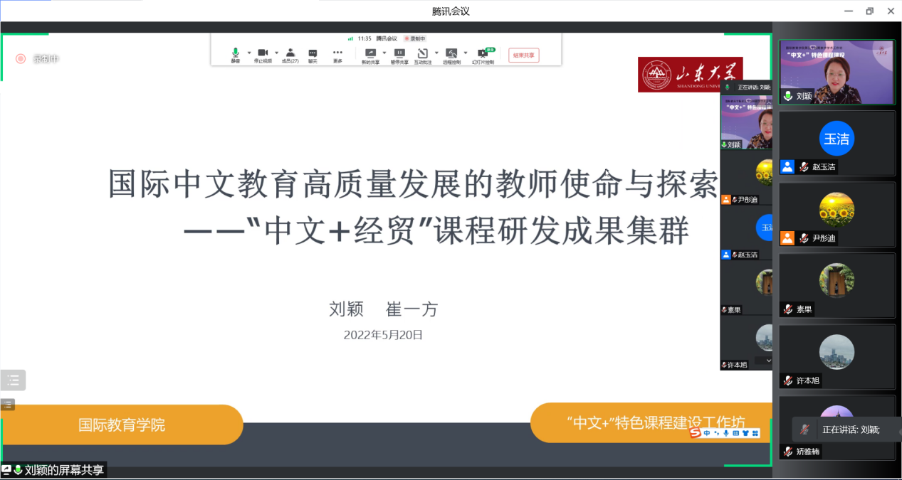 工作坊邀请刘颖教授作“国际中文教育高质量发展的教师使命与探索——‘中文+经贸’课程研发的成果集群”主题发言,对“中文+经贸”课程从策划设计、立项论证、配套教材研发试用,到课程海外推广、资源建设、课题研究等发展阶段的要点,及课程创新成果集群的生成与发展进行了全生命周期的介绍,分享了三方面的实践经验:一是充分考虑到海外学习者接受程度差异,让世界各国商务汉语学习者学到中文词汇的同时,通过主题教学与交流,展示各自国家的科技和经济发展现状,增进各国青年相互了解;二是依托“汉语桥”线上团组项目,调动学院青年教师、研究生助教等组建教学团队,联动学院项目拓展、教学管理等部门实现协同推进,以海外需求为导向实现课程难易程度和教学方式动态优化;三是整合院内外、校内外的优质教育与社会资源,成功举办“汉语桥‘一带一路’国际青年经贸论坛”,探索跨院系合作与协同创新,进一步固化国际需求与国家发展融合、贸易互通与民心相通融合、专业教育与思政教育融合的发展路径,先后得到中国日报网、教育部中外语言交流合作中心等媒体的报道。在总结中,刘颖从“师者、学者、建设者”对应“人才培养、科学研究、社会服务”三方面,分享了在国际中文教育转型升级的新时代,高校教师的使命担当和不懈探索,针对高校教师立德树人、科学研究、服务社会等角色的有机统一提出了自身思考。倡导教师充分发挥主体作用,积极探索与学校其他优势专业相结合的可能性,在教学实践中转化科研成果,成果反哺社会。