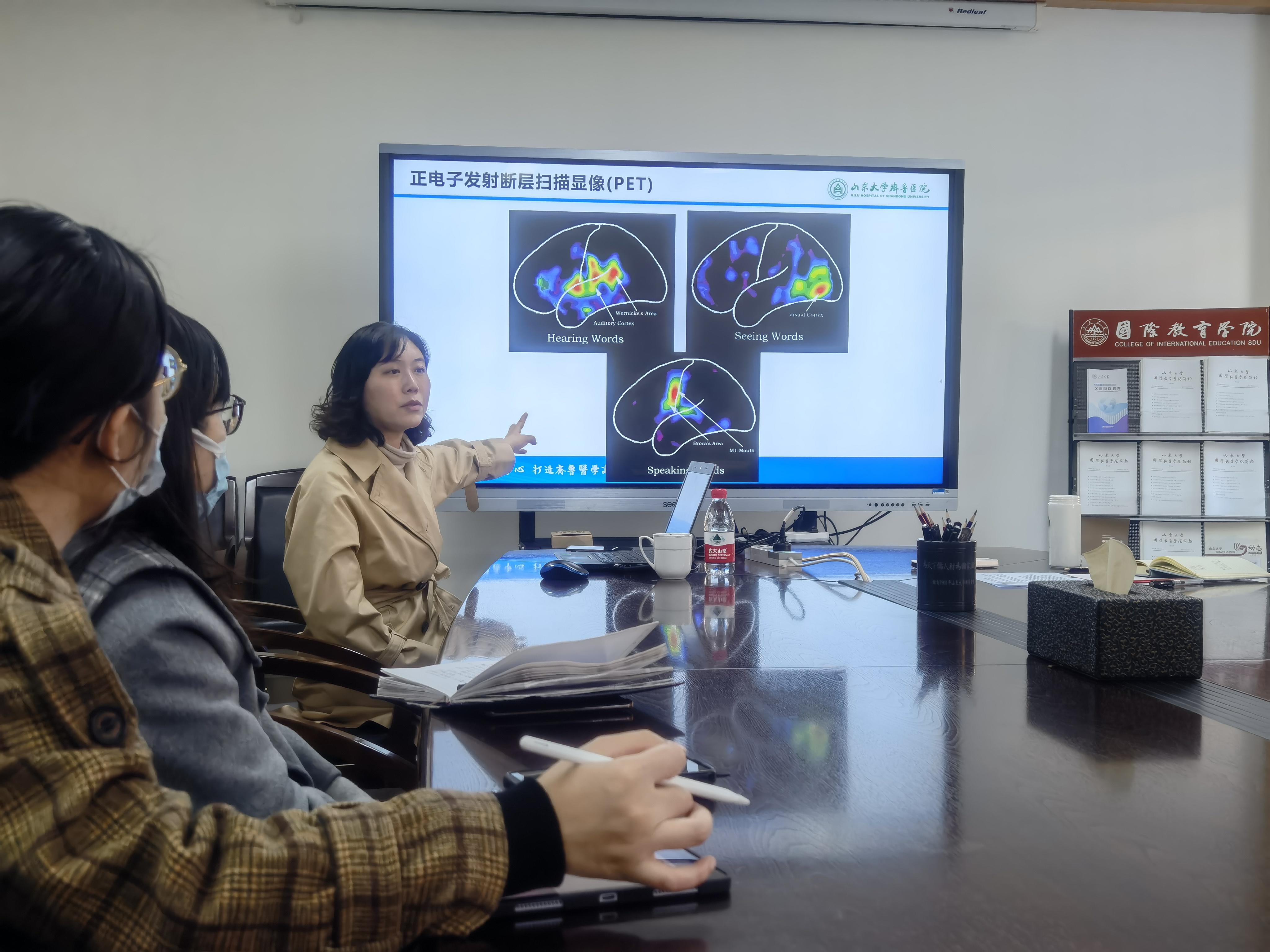 在交流研讨环节,我院教师结合自身的教学实践经历和研究思考,分别从近义词和等义词的判别、学困生的指导帮助、语言习得困难的原因识别、教学设计优化等方面向曹爱华请教了借助脑电设备开展实验研究的相关问题,并进行了深度的交流讨论。曹爱华建议大家通过阅读前沿文献,借助已有的研究范式和观察量表,从模仿学习开始设计语言教学相关的实验。