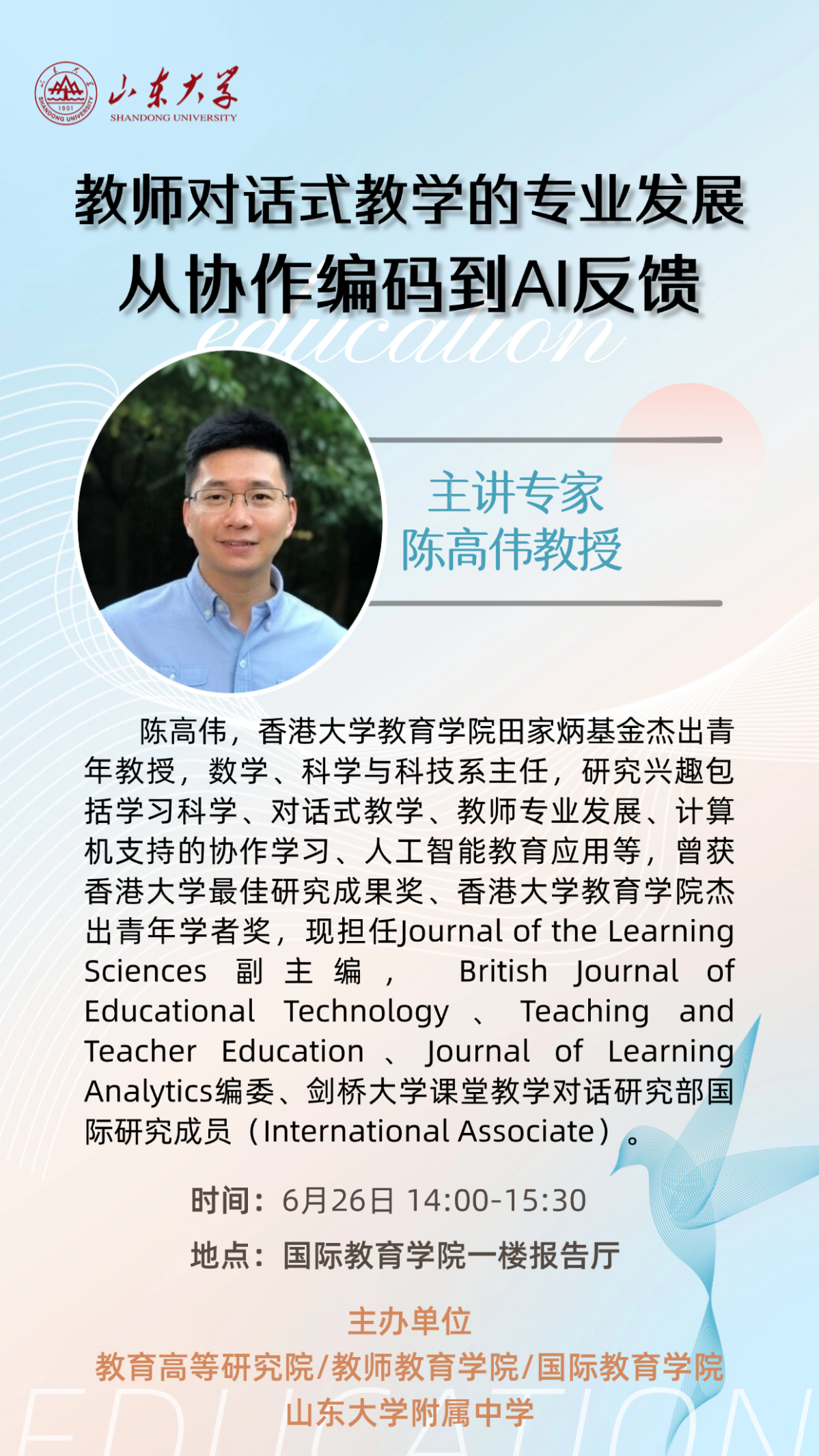 陈高伟,香港大学教育学院田家炳基金杰出青年教授,数学、科学与科技系主任,研究兴趣包括学习科学、对话式教学、教师专业发展、计算机支持的协作学习、人工智能教育应用等,曾获香港大学最佳研究成果奖、香港大学教育学院杰出青年学者奖,现担任Journal of the Learning Sciences 副主编, British Journal of Educational Technology、Teaching and Teacher Education、Journal of Learning Analytics编委、剑桥大学课堂教学对话研究部国际研究成员(International Associate)。
