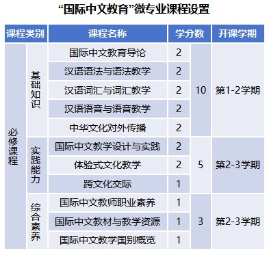 围绕国际中文教育人才核心能力与素养,开设18学分课程,具体课程如下:国际中文教育导论、汉语语法与语法教学、汉语词汇与词汇教学、汉语语音与语音教学、国际中文教学设计与实践、体验式文化教学、中华文化对外传播、跨文化交际、国际中文教师职业素养、国际中文教材与教学资源、国际中文教学国别概览等。以上课程与《国际中文教师证书》考试具有一定对应关系。