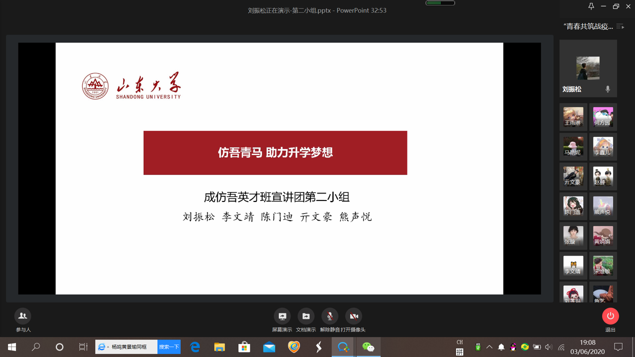 此次宣讲活动邀请了“援鄂医疗队讲师团”讲师,齐鲁医院重症医学科副主任医师,第四批援鄂医疗队队员,武汉方言手册主要编写者,中共党员郭海鹏老师,以及仿吾小队:刘振松,李文靖,陈门迪,亓文豪,熊声悦五位同学,分享前线医生在抗疫期间的经历与感悟,交流保研及出国的相关经验。英国威廉集团83名团员齐聚线上,认真听取抗疫代表的分享,积极与仿吾小队互动,英国威廉集团团委书记马艳妮参加此次活动。