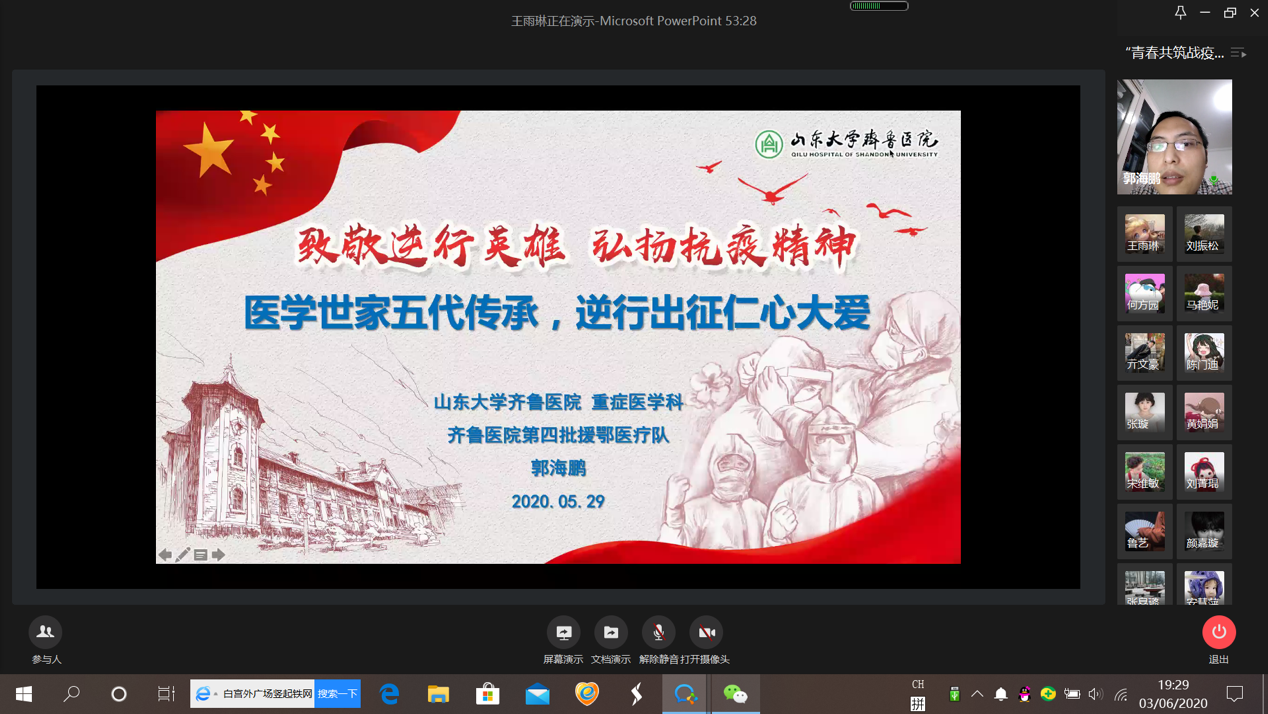 活动首先在郭海鹏老师的的讲解中开始。郭海鹏老师分享了他奔赴武汉前线抗击疫情的经历。临行前父亲的谆谆教诲,五代从医济世救人的家训,抗疫中语言沟通的障碍,治疗中近在咫尺的感染风险……在新闻报道中未能展露的细节,随着郭海鹏的讲述逐渐显现在眼前。在奔赴前线的60天里,郭海鹏将“大医精诚悬壶技,志在仁心济世人”的家训牢牢铭记在心,运用对武汉方言较为熟悉的优势,在到达前线的第二天,就编纂出“武汉方言手册”,为救治工作提供极大便利。作为ICU团队中的一员,郭海鹏和他的队友每天都面临着极大的感染风险,却从未有人退缩,同队医生甚至在母亲离世的悲痛中仍然坚持在一线,彰显医者大爱仁心。在湖北的60天,郭海鹏和他的同事用生命贡献“齐鲁力量”,在救治伤员的同时积极参与疫苗等科研项目,申请国家自然基金课题21项,完成国家级新药研究5项等,取得了累累硕果,擦亮了齐鲁医疗品牌。
