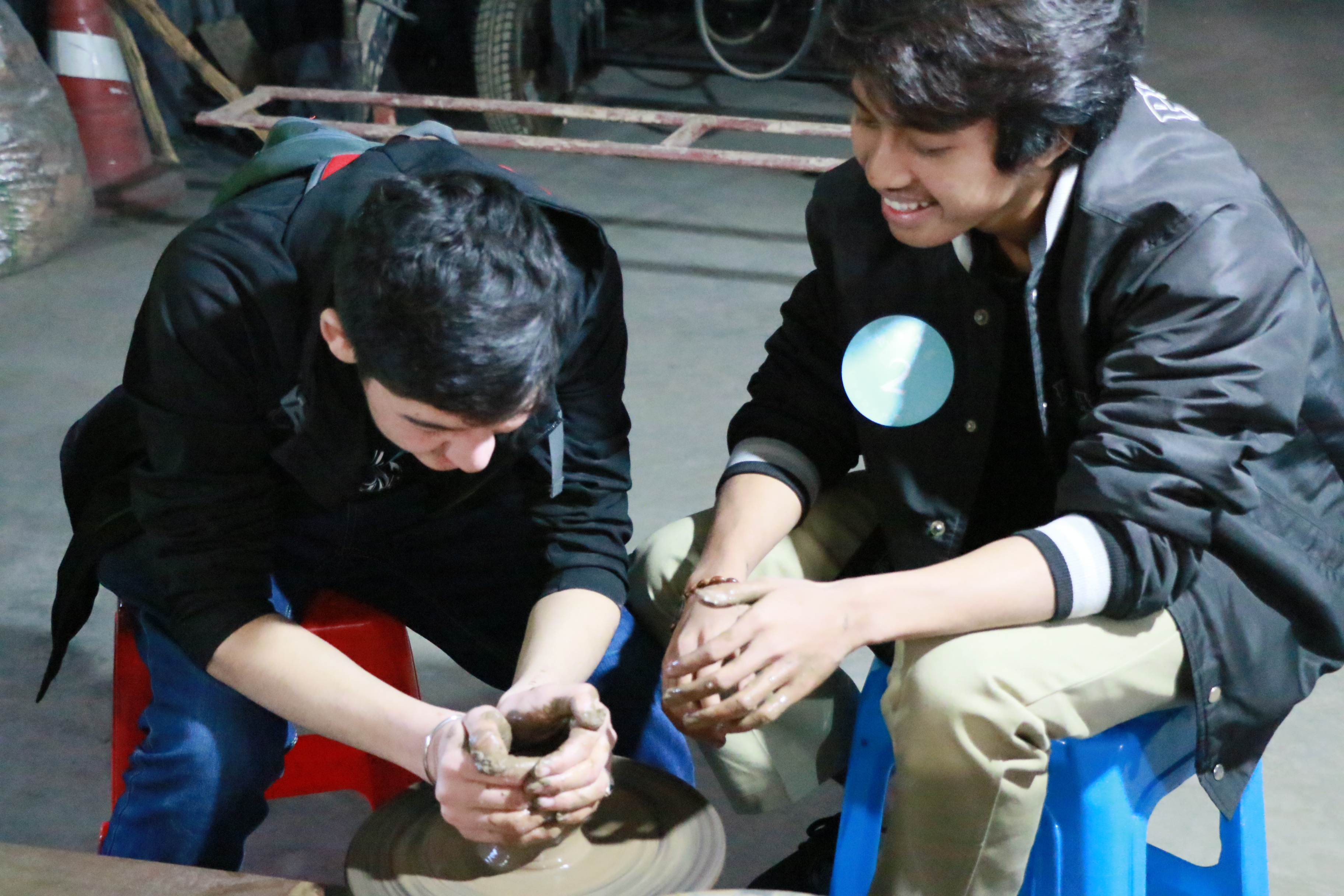 在参观了蛋壳陶、黑陶、红陶等精美展品后,张老先生带着同学们来到了他的陶艺作坊。中外学生都惊诧于黑陶全手工制作的复杂过程。从“从一团泥巴到成品,要经过选土、晒土、浸泡过滤、沉淀缩水、制泥、制坯、晾坯、修坯、压光、刻花、干坯、烧制等复杂环节,这些都是手工活儿。”陶工们的技术娴熟,充分展示了中国传统技艺传承者们的高超技艺。现场赞叹声不绝,中外学生纷纷表示:“这太神奇了!”参观结束后,张老先生亲身示范指导学生们开始黑陶制作体验,在老师的耐心指导下同学们完成了人生中第一件黑陶作品,大家认真地在亲手制作的黑陶上刻下自己的名字,作为永久纪念。