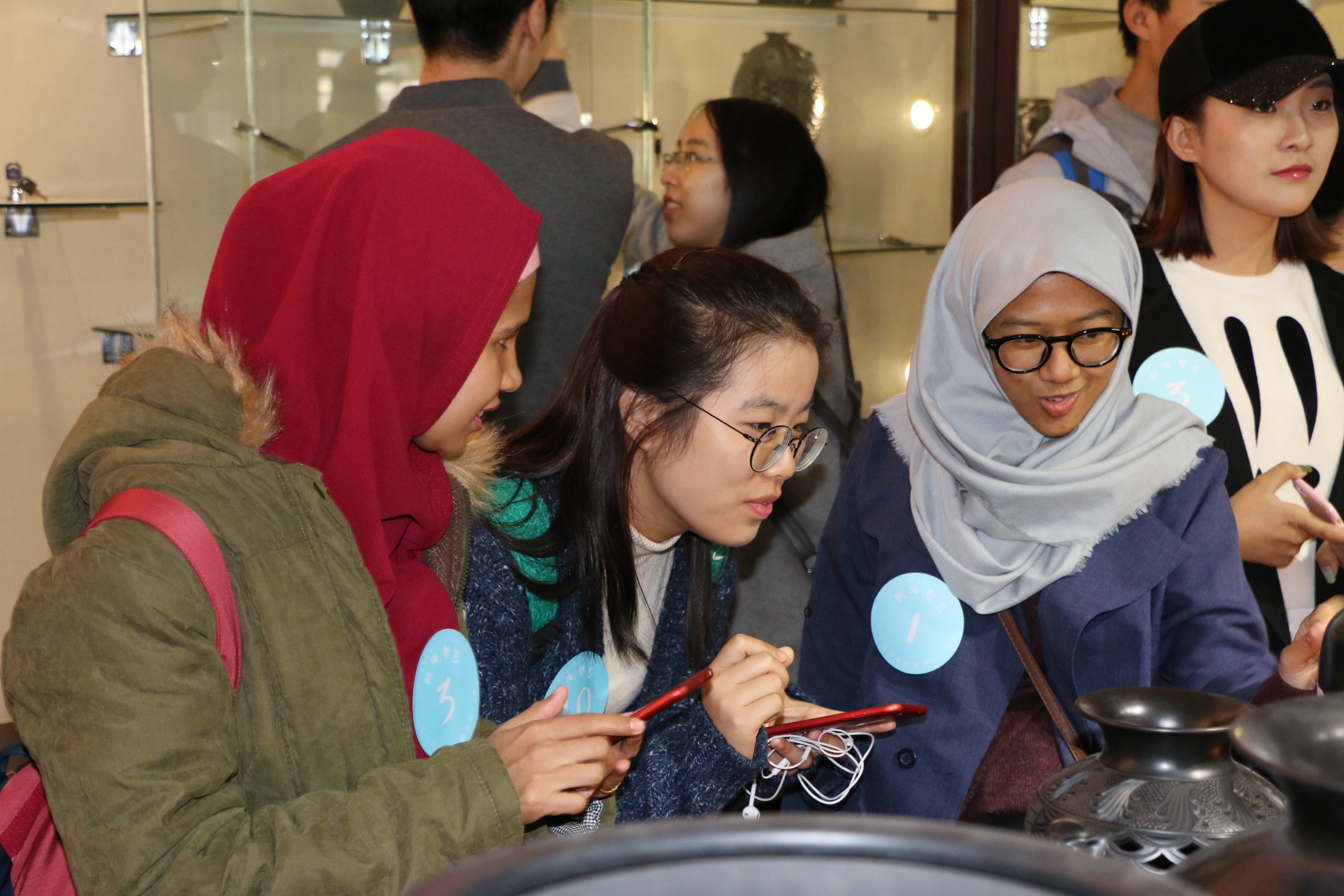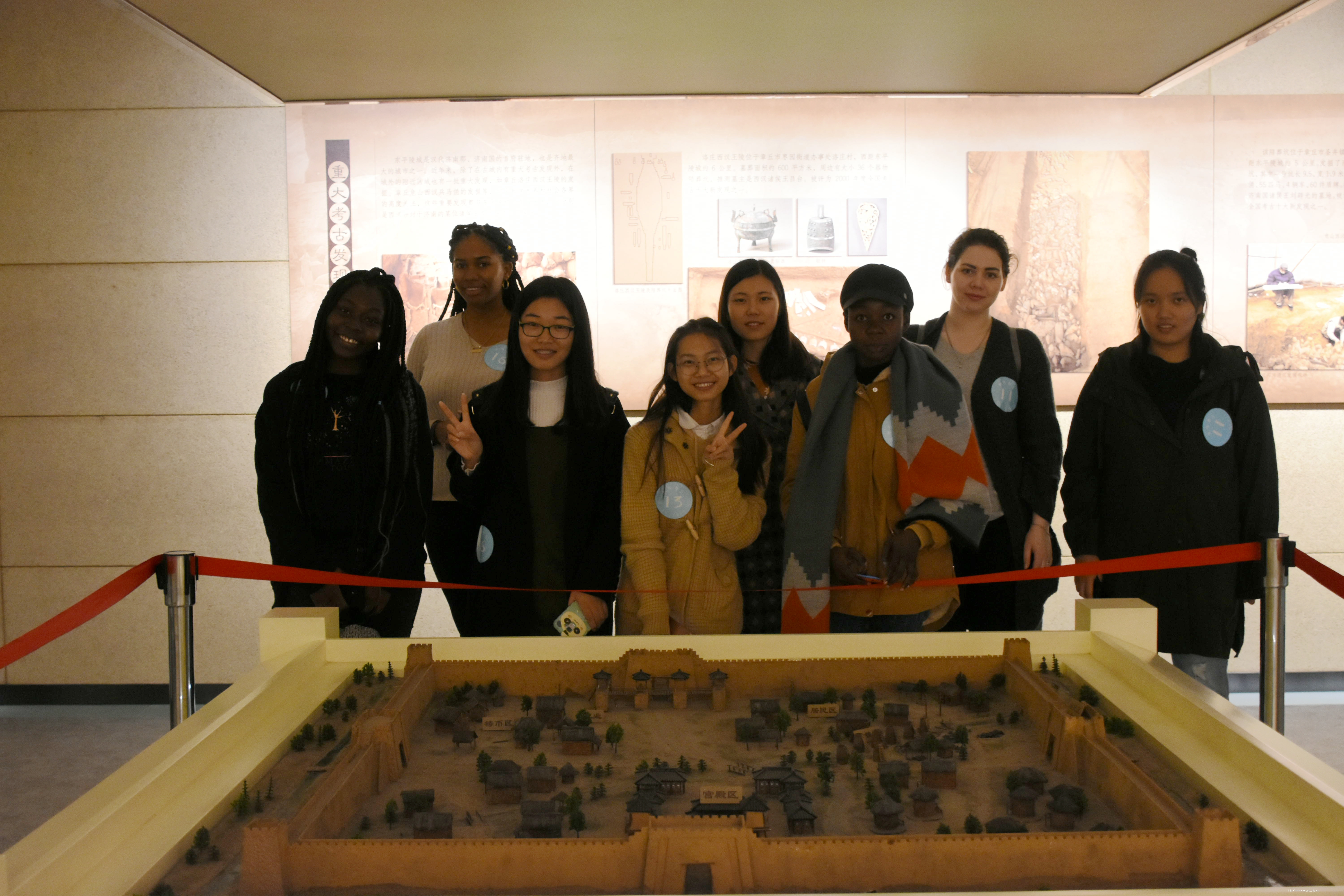 之后,中外学生一起来到龙山文化博物馆,进一步了解以黑陶为显著特征的龙山文化。每个小组中的中国学生都成了留学生的专属讲解员,来自历史文化学院考古专业的匡玉霞,结合专业优势用娴熟的英语讲解每处遗址的特点,吸引了众多留学生听众。