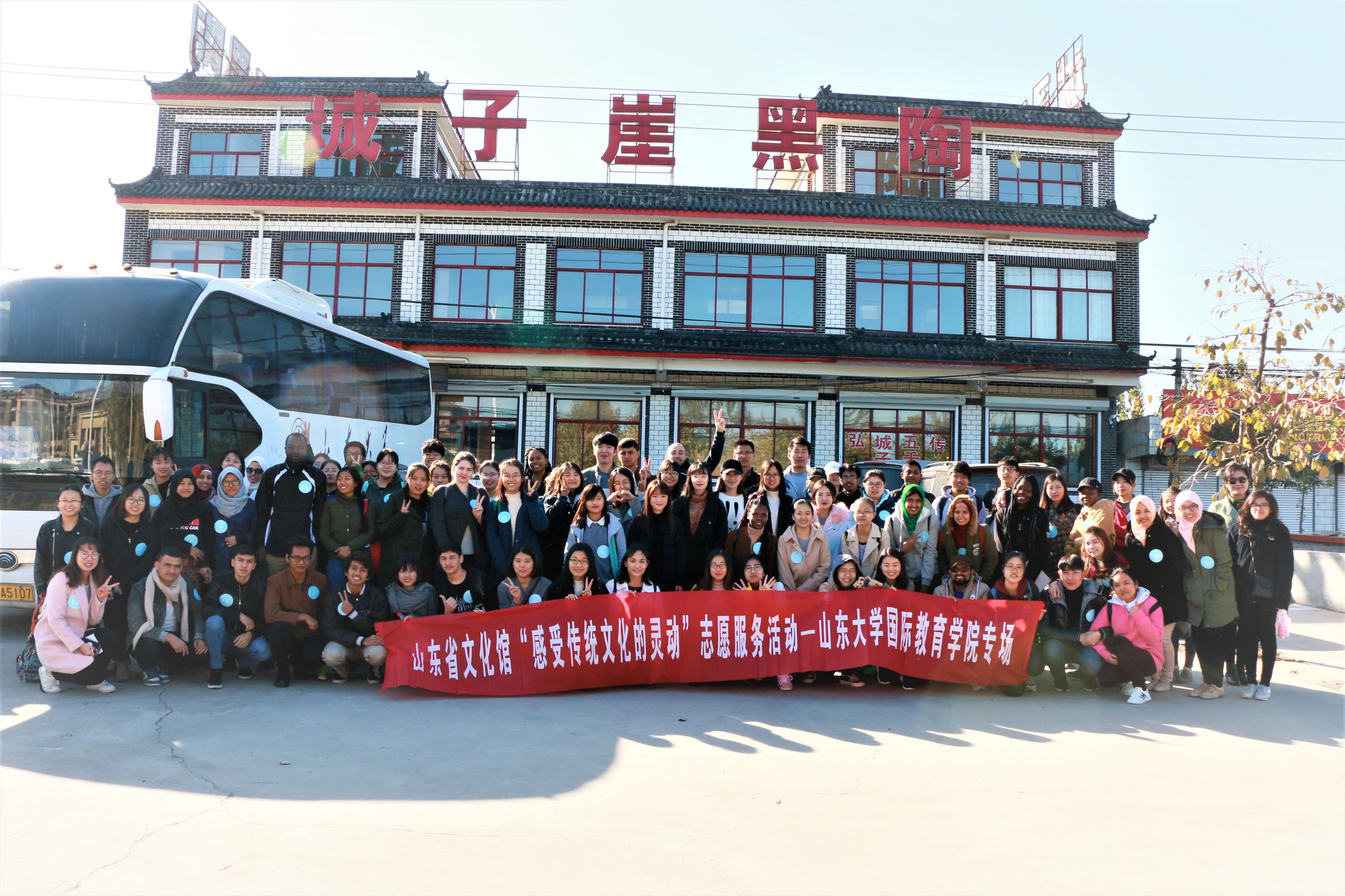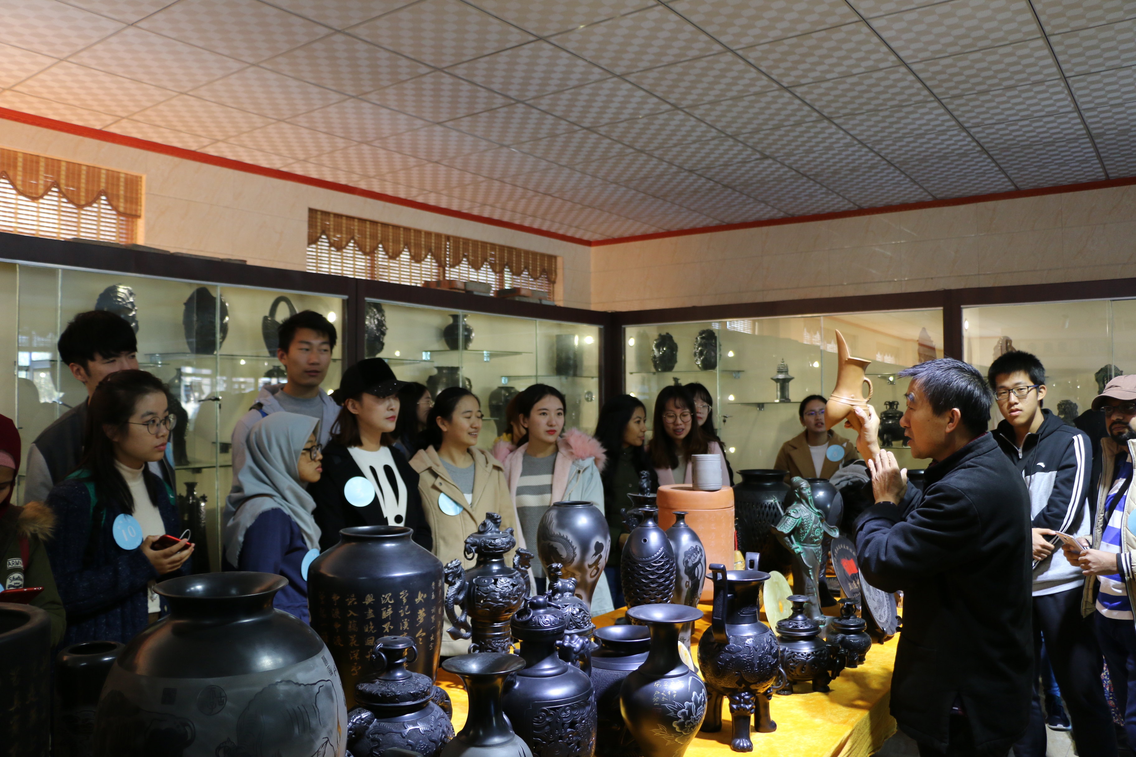 抵达城子崖黑陶艺术馆后,山东省文化馆社会文化服务部主任徐欣对山大师生的到来表示热烈欢迎,希望同学们能够通过这次活动真切地感受到中国传统文化的灵动。山东省文化馆特别邀请到山东省工艺美术大师、中国黑陶非物质文化遗产传承人张国庆大师到场讲解黑陶文化,指导制陶技巧。中外学生们都因龙山黑陶的古朴大方惊艳不已。张老先生在介绍自己作品的同时,还不忘跟在场的留学生说:“黑陶是中国的宝贝,是我们不可多得的传统文化,希望你们能够从我的讲解和作品里体会到这些文化,也希望你们能够喜欢。”