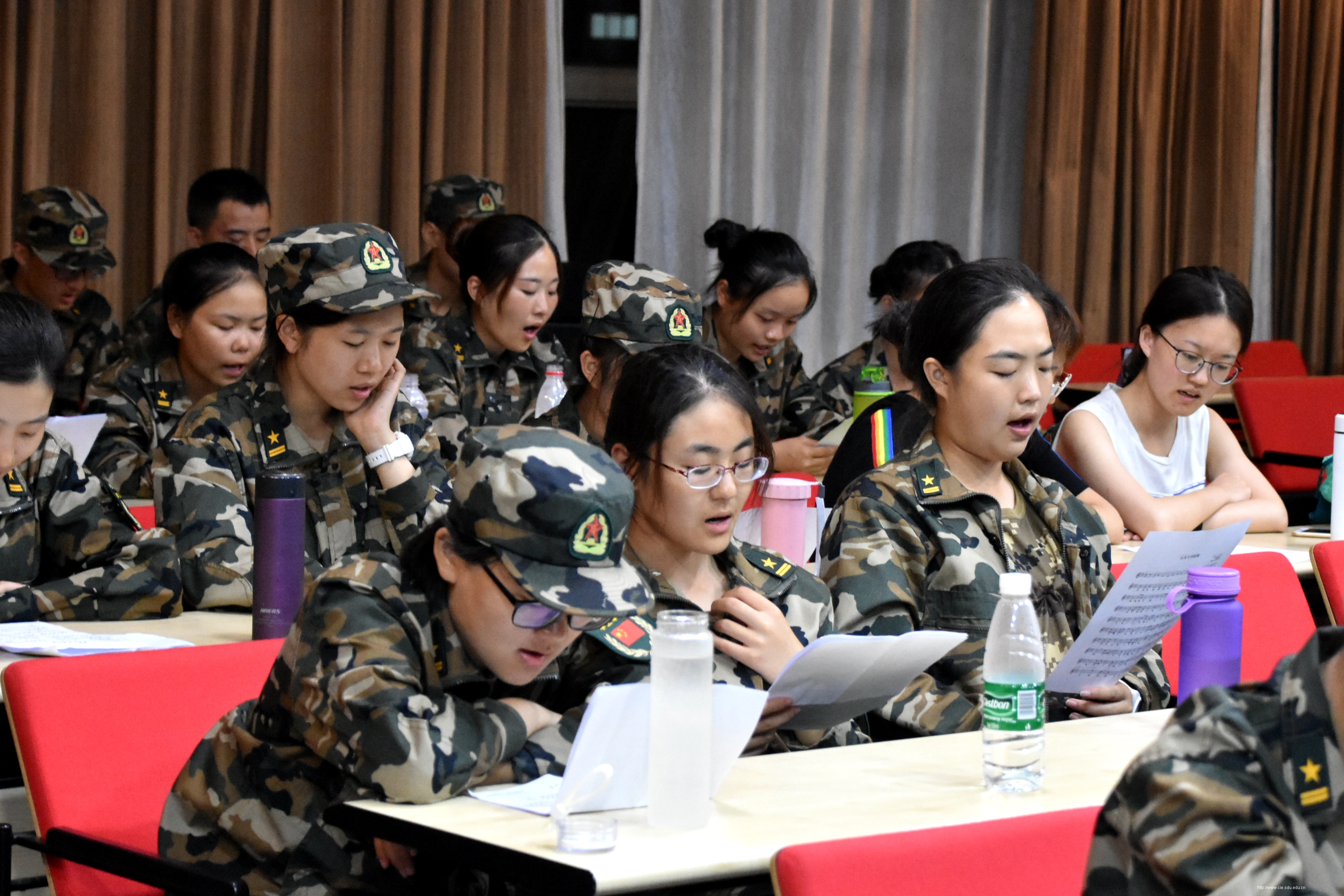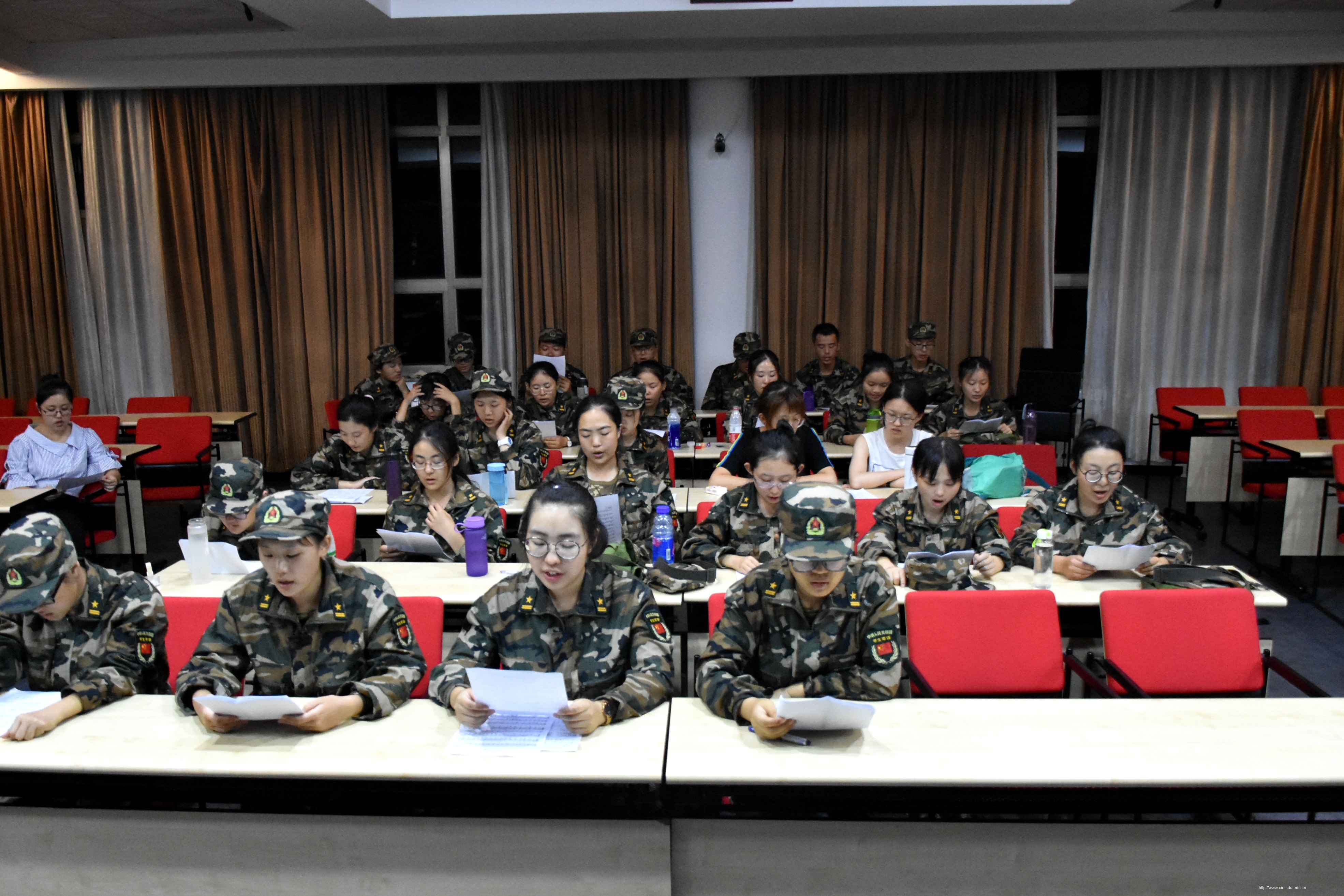 晚训结束后,2017级新生迈着整齐的步伐来到学院报告厅。经过了一整天的高强度训练,同学们身体都十分疲惫,但是他们仍旧以饱满的热情投入到学唱校歌的活动当中。