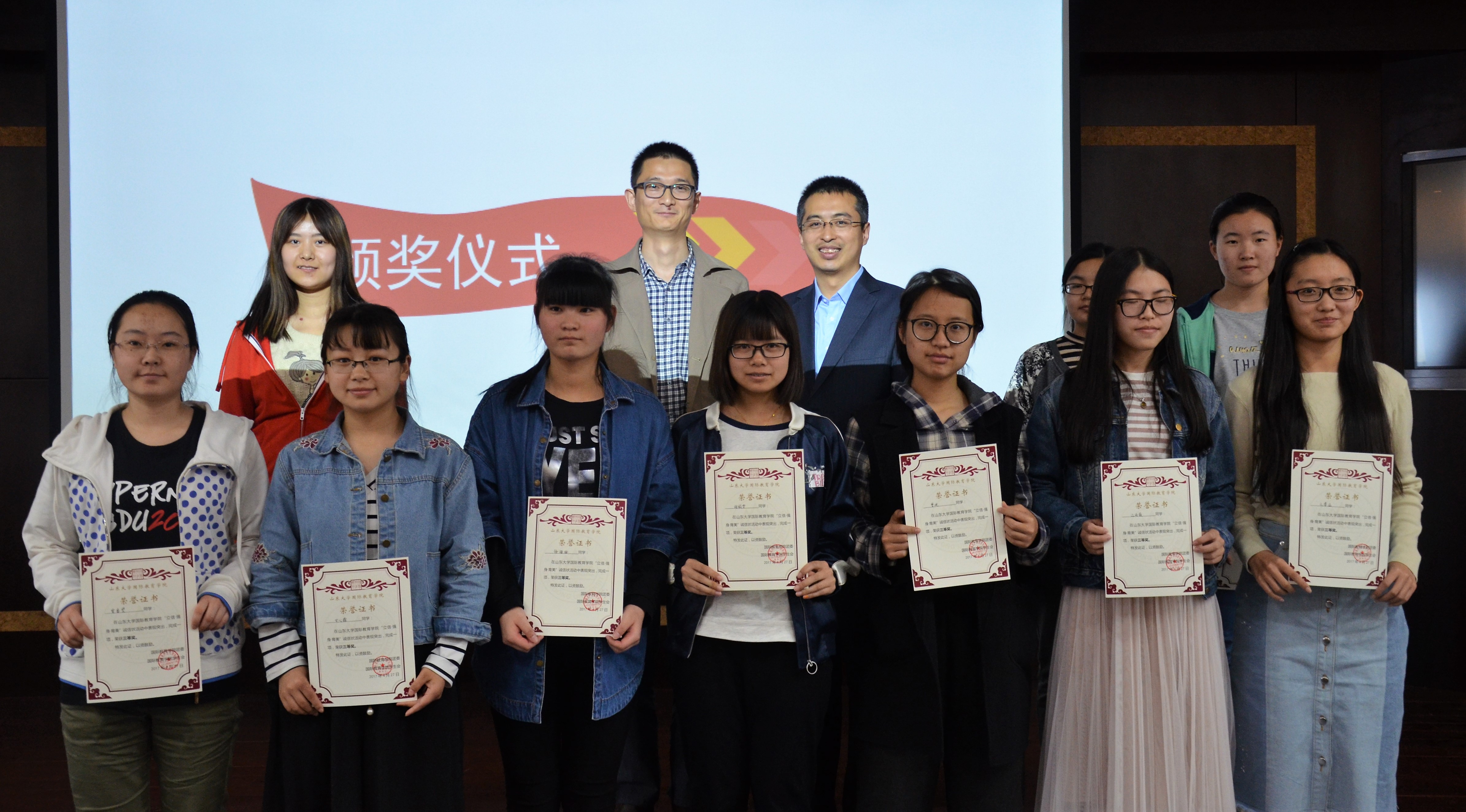最后,孙鹏程主任和李安老师为完成“诚信状”活动的同学颁奖并合影留念。