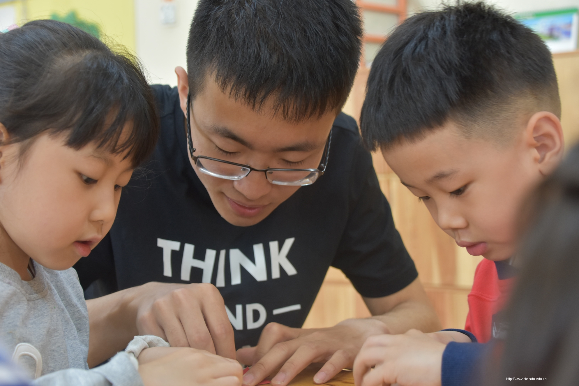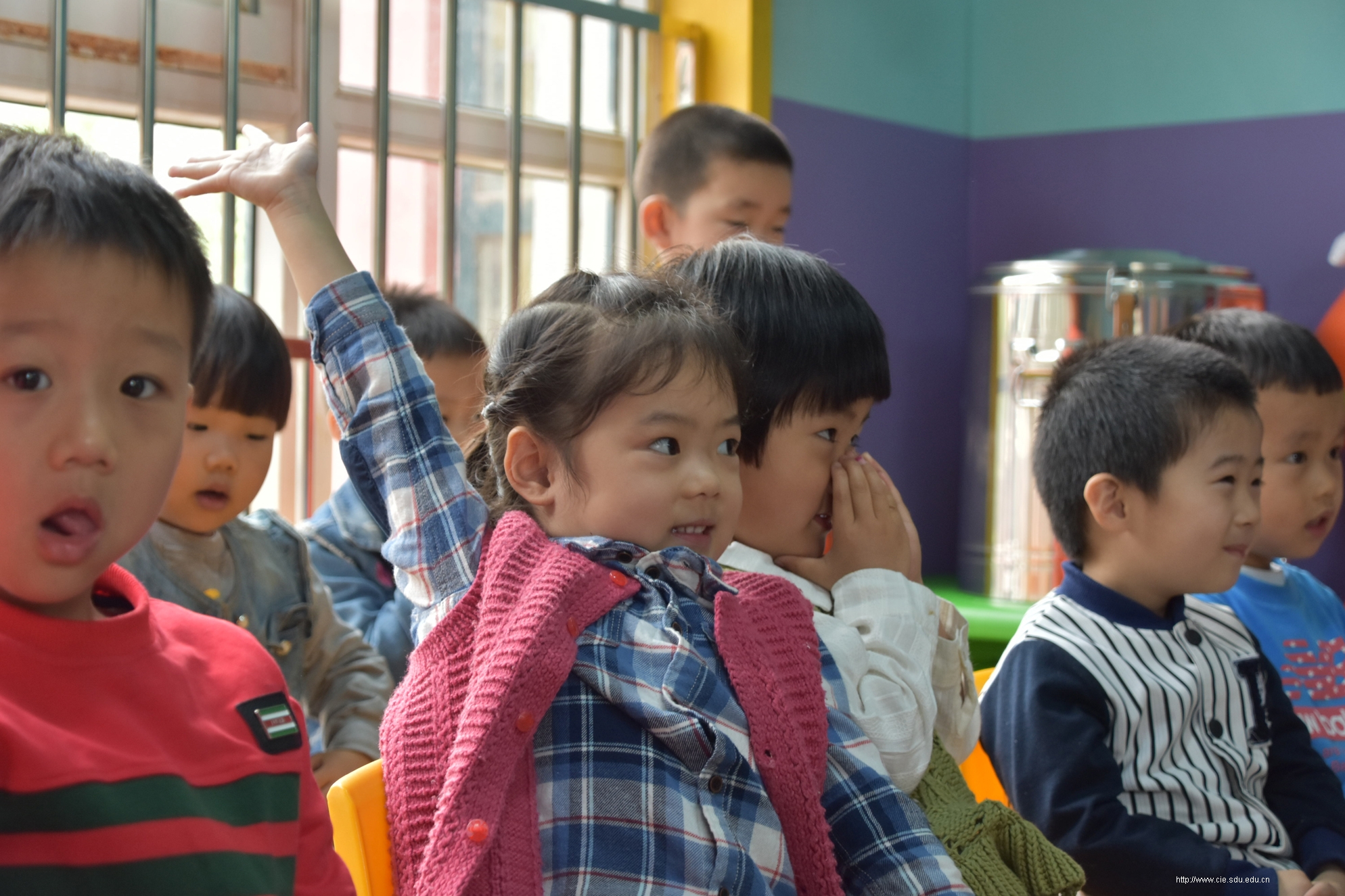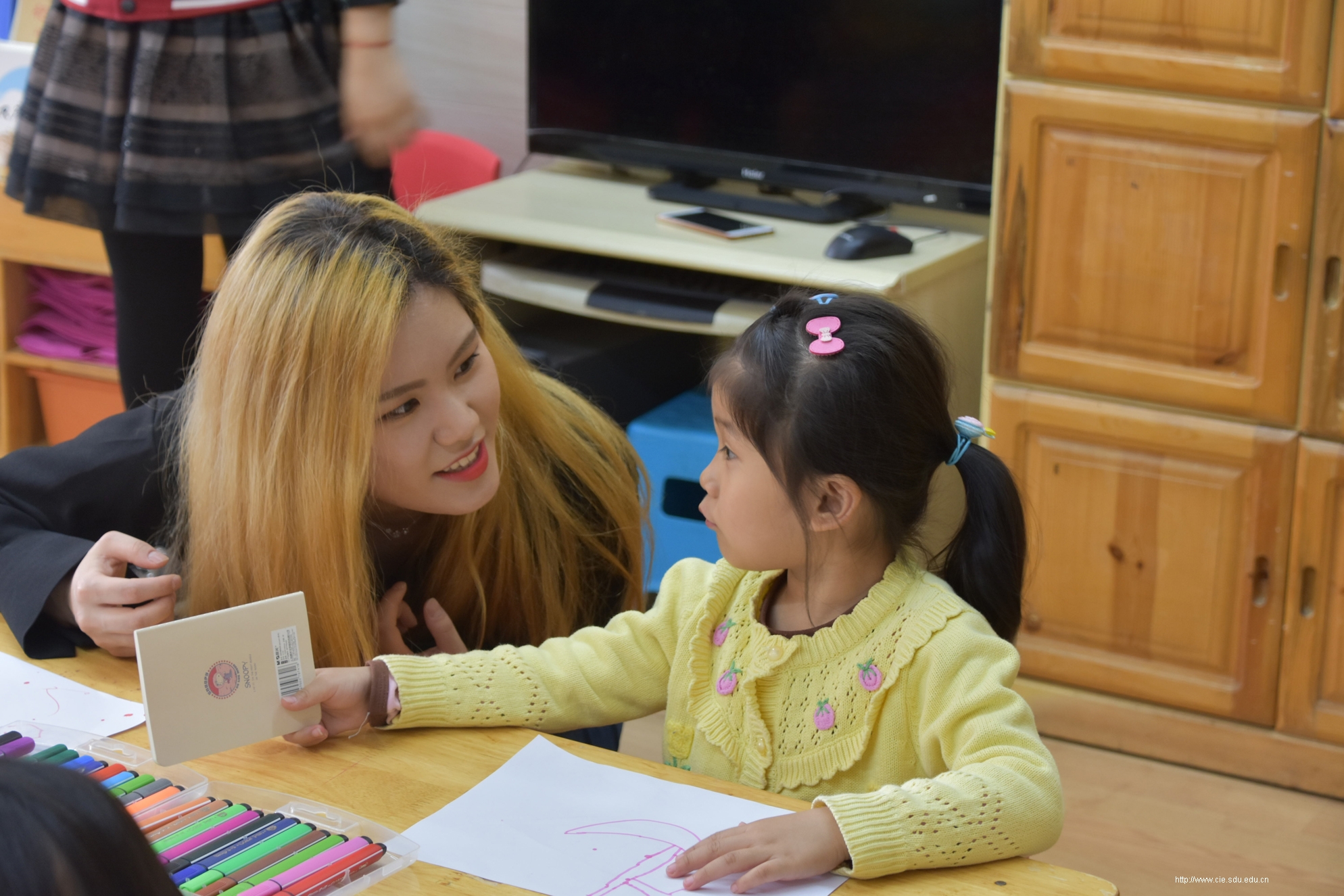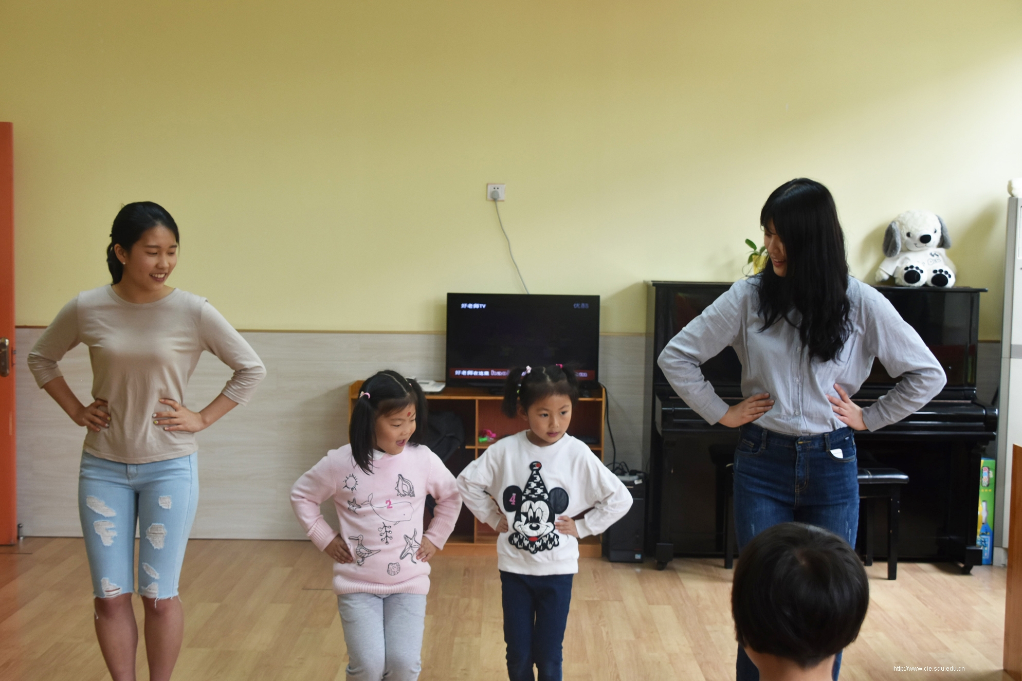 4月24日一早,志愿者们便搭乘公交车来到了大风车幼儿园,按照之前的分组分别进入大班、中班、小班进行教学。在与小朋友互相做过自我介绍后,便开始了教学活动。首先,韩国志愿者向小朋友们教授了如:“爸爸”、“妈妈”、“老师”等简单的韩语词汇,孩子们对学习新语言产生了浓厚的兴趣。接下来,中韩志愿者们分别教孩子们唱了《小白船》《三只熊》等儿歌,孩子们十分活泼,与志愿者们一同演唱。教学楼里洒满了孩子们的欢声笑语。