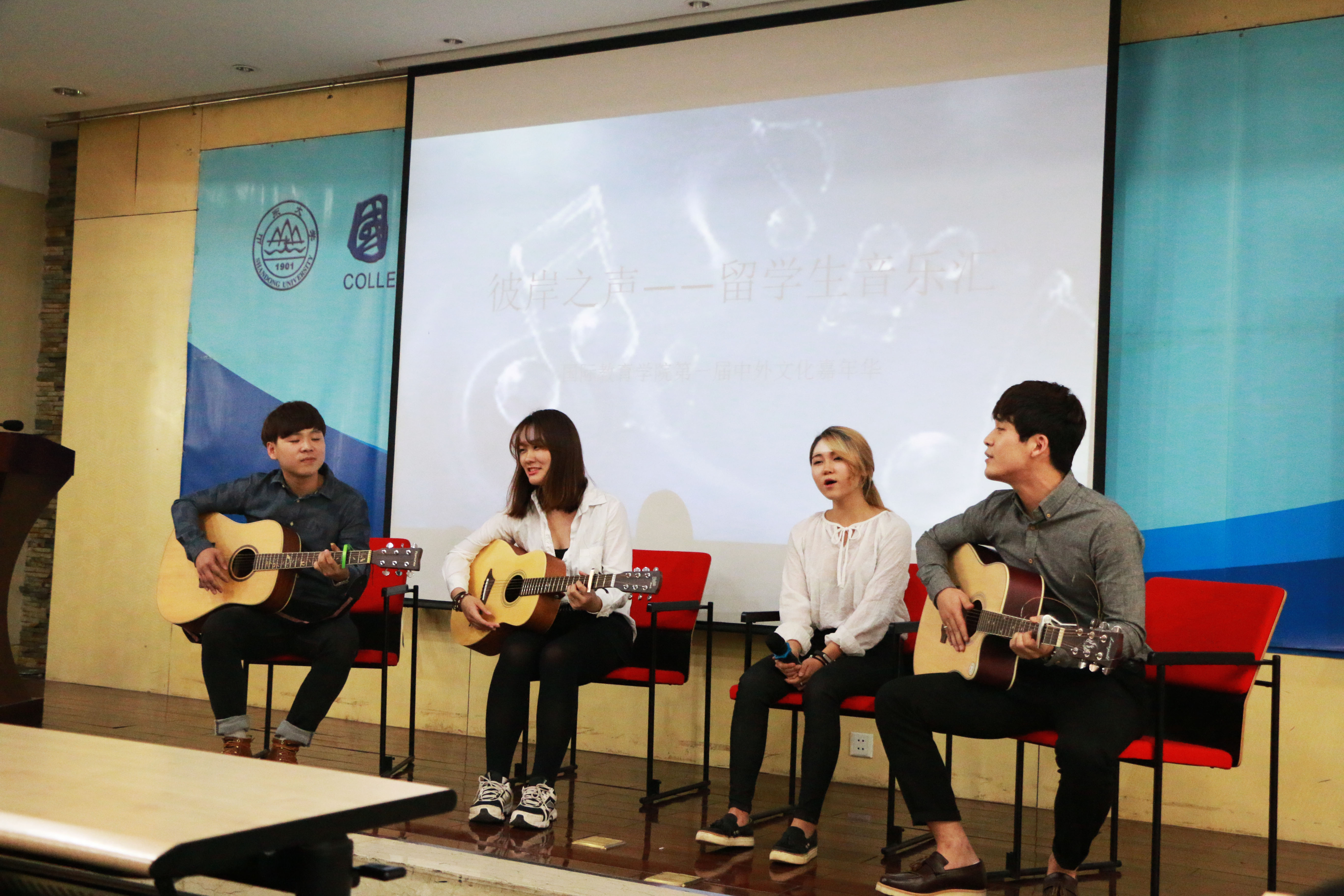 首先是歌曲表演与教授环节。第一首歌曲是由4位韩国留学生带来的吉他弹唱《贝壳》,观众受到现场氛围的感染,一齐随着旋律拍打起节奏。接下来,圭亚那留学生李瑞龙演唱的民族歌曲饱含了对祖国的赞美与热爱:美丽的热带雨林,富饶多样的物产,热情智慧的人民。感情满满的音乐赢得了热烈的掌声。最后,墨西哥留学生查尔斯献上的吉他弹唱令人陶醉,引人遐思。歌曲表演完毕,由观众作为学员挑选留学生导师并向其学习歌曲。现场观众积极踊跃,气氛异常热烈。分组后,“学歌队伍”在学院大厅开始了歌曲学习。导师认真地教,学员投入地学,虽然语言不同,但是心意相通。