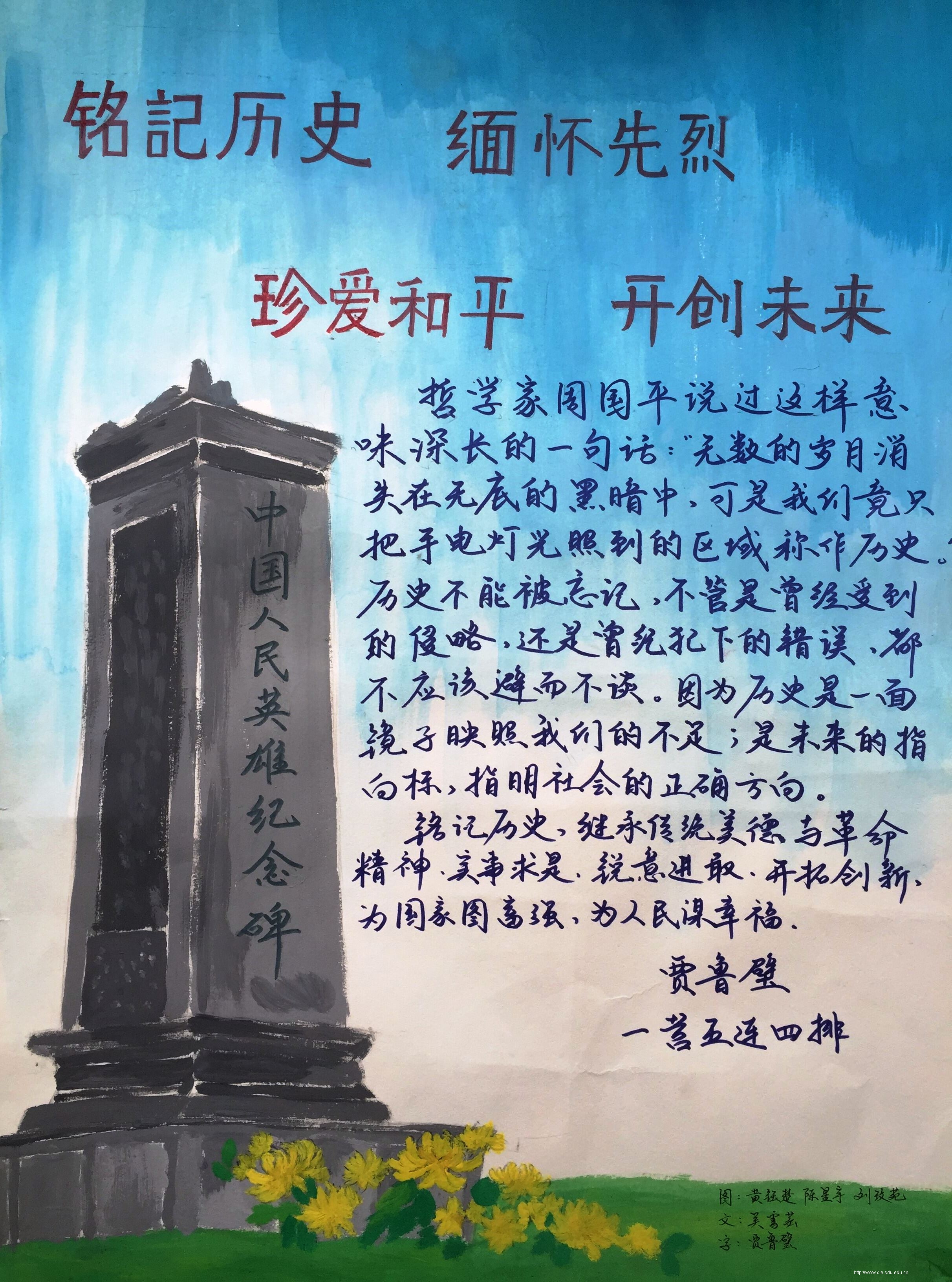 抗战时期,那是它最苦难的一段岁月。日日夜夜,炮火轰鸣,再也听不见人们的安宁梦呓,只剩下惊恐的哀嚎。日寇占领了无数座城,肆虐抢掠,恬不知耻。这些苦难却丝毫没有撼动中国人的赤子之心。 至此,决不投降!决不放弃!决不懈怠!从最渺小的尘埃里熔炼出最强大的军队,从最简陋的武器中凝聚出最团结的战斗力。在教科文组织总部大楼前的石碑上,用多种语言镌刻着这样一句话:“战争起源于人之思想,故务需于人之思想中筑起保卫和平之屏障。”我曾读到过过抗战时期老父送子出征的死字旗:“国难当头,日寇狰狞。国家兴亡,匹夫有分。本欲服役,奈过年龄。幸吾有子,自觉请缨。赐旗一面,时刻随身。伤时拭血,死后裹身。勇往直前,勿忘本分!”